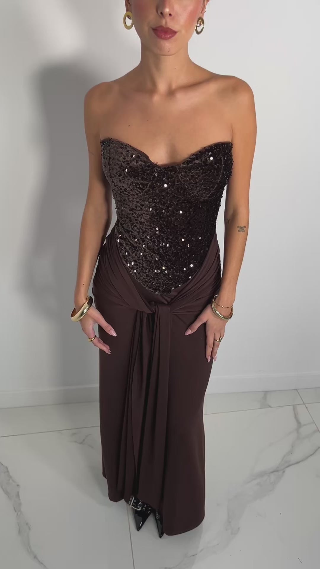 Este vestido palabra de honor destaca por su combinación única de tres materiales: licra, terciopelo y lentejuelas, que aportan textura y sofisticación. El nudo en la zona del torso crea una caída elegante que favorece la silueta, mientras que su largo añade un toque de formalidad ideal para ocasiones especiales. Un diseño equilibrado que une comodidad y estilo en una prenda versátil y moderna.
