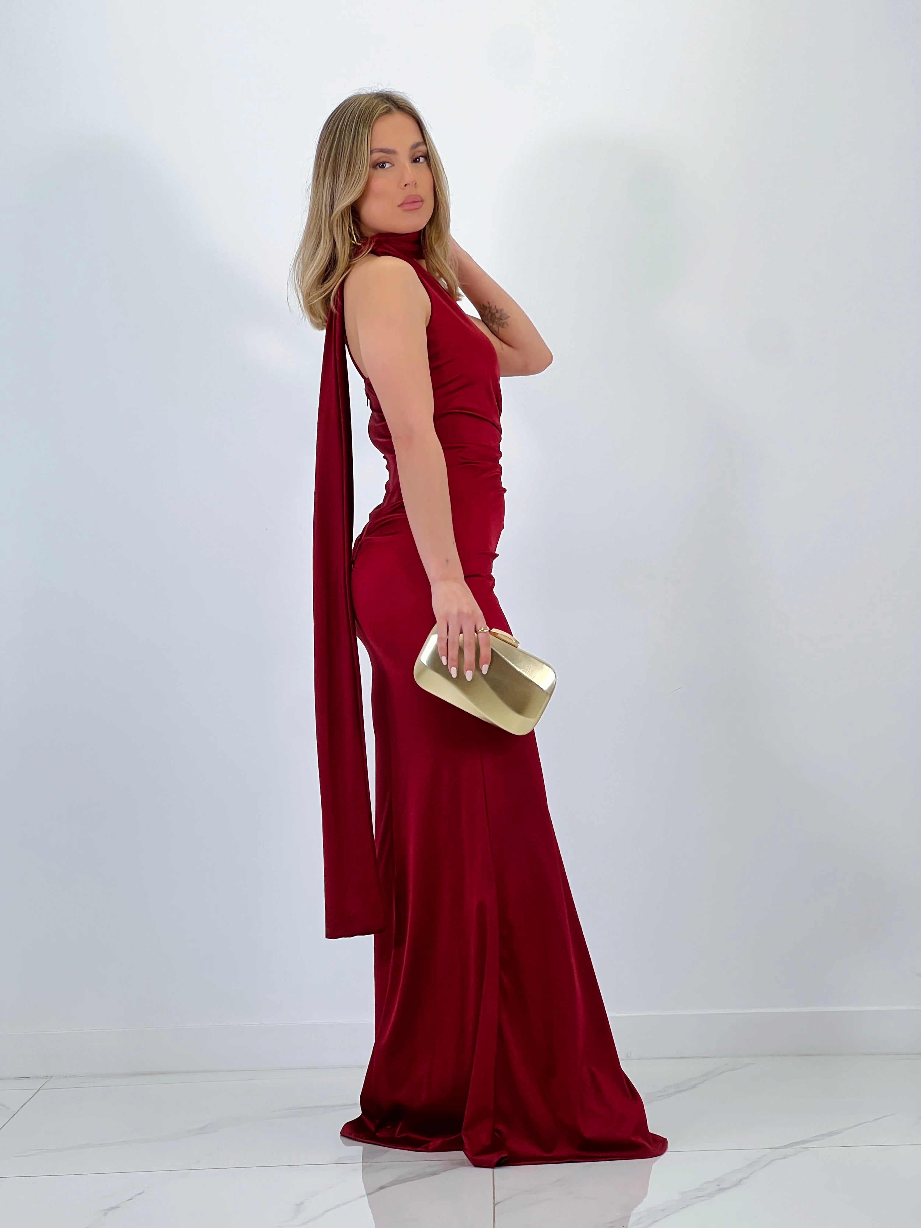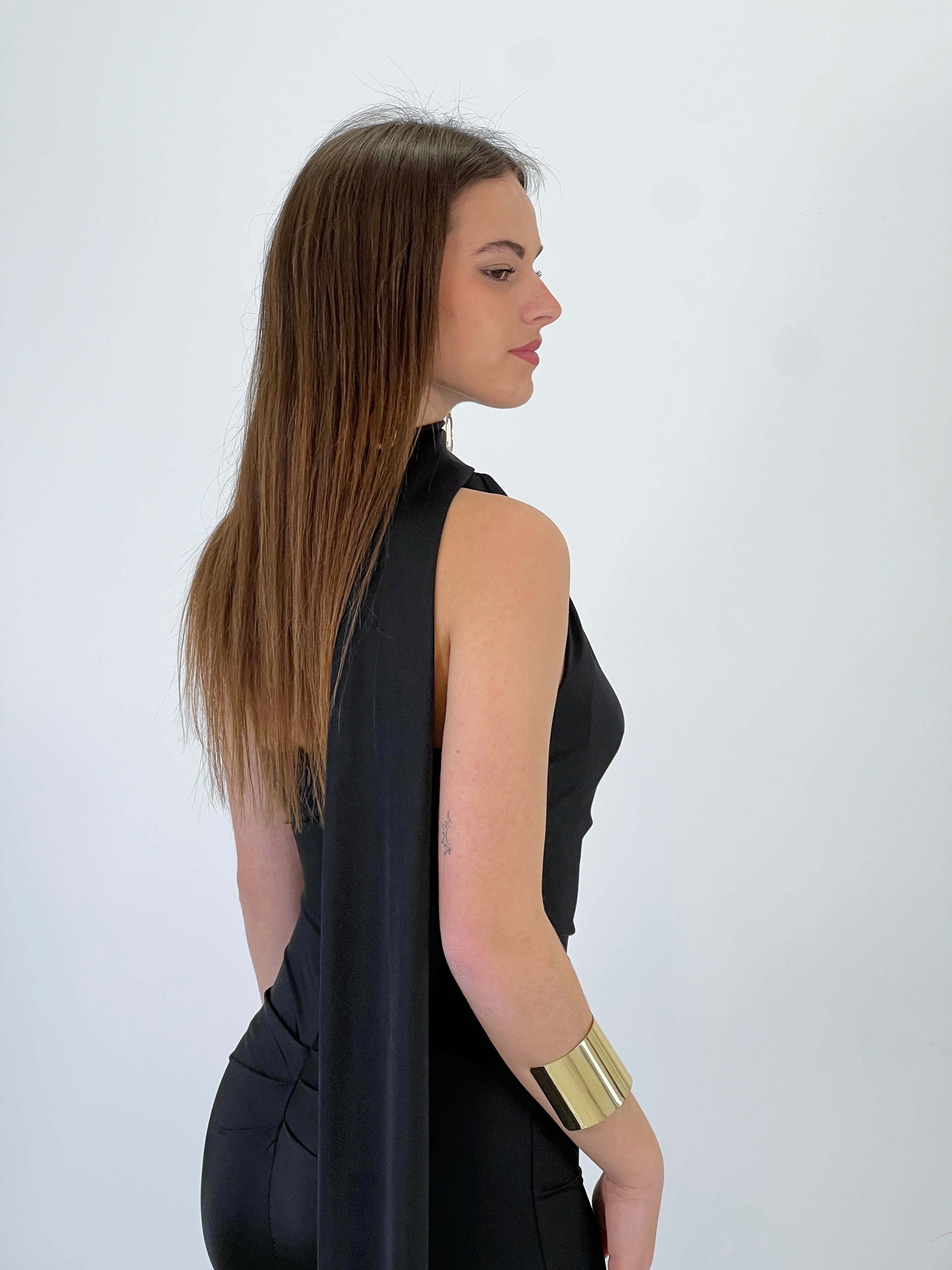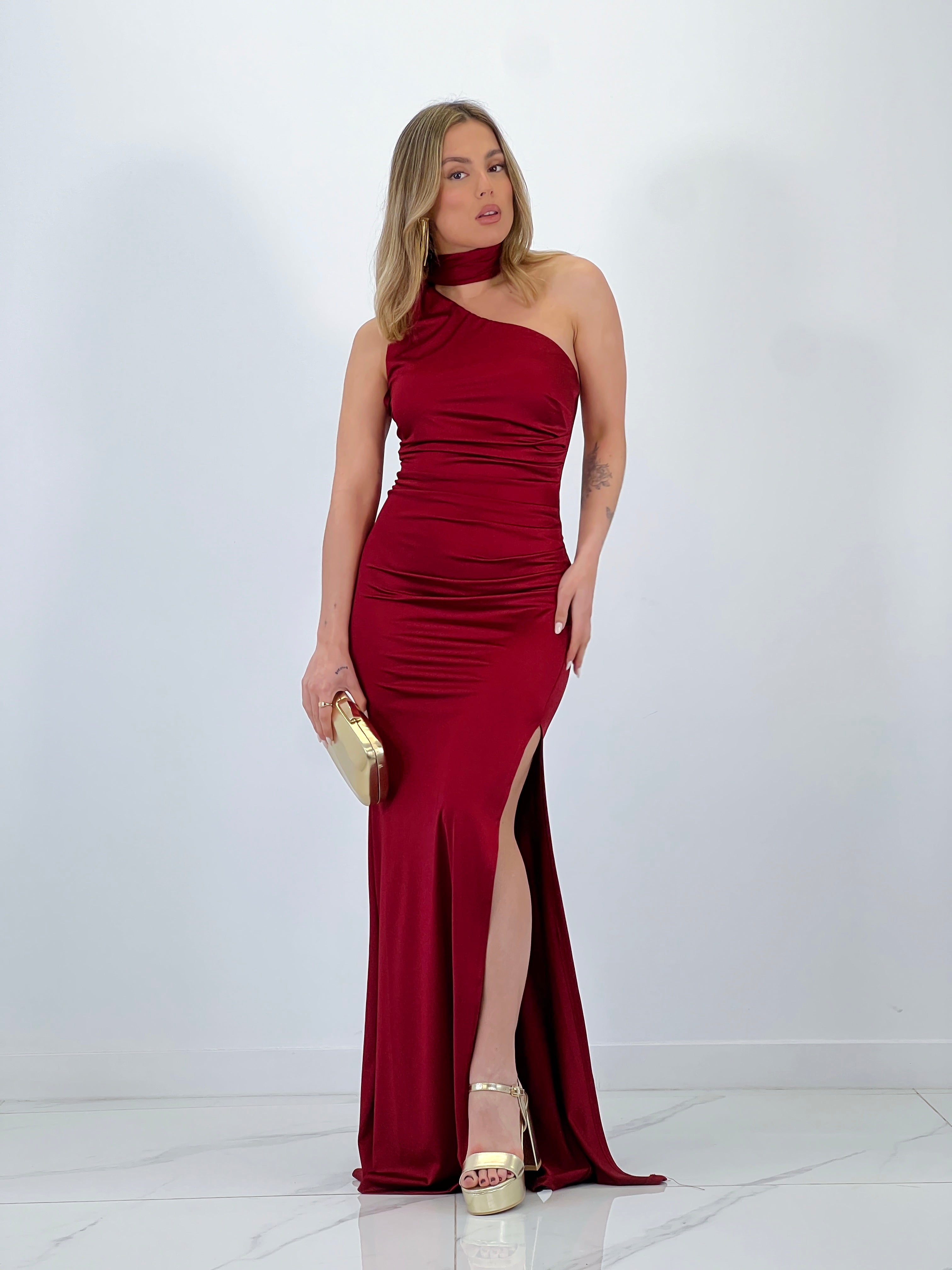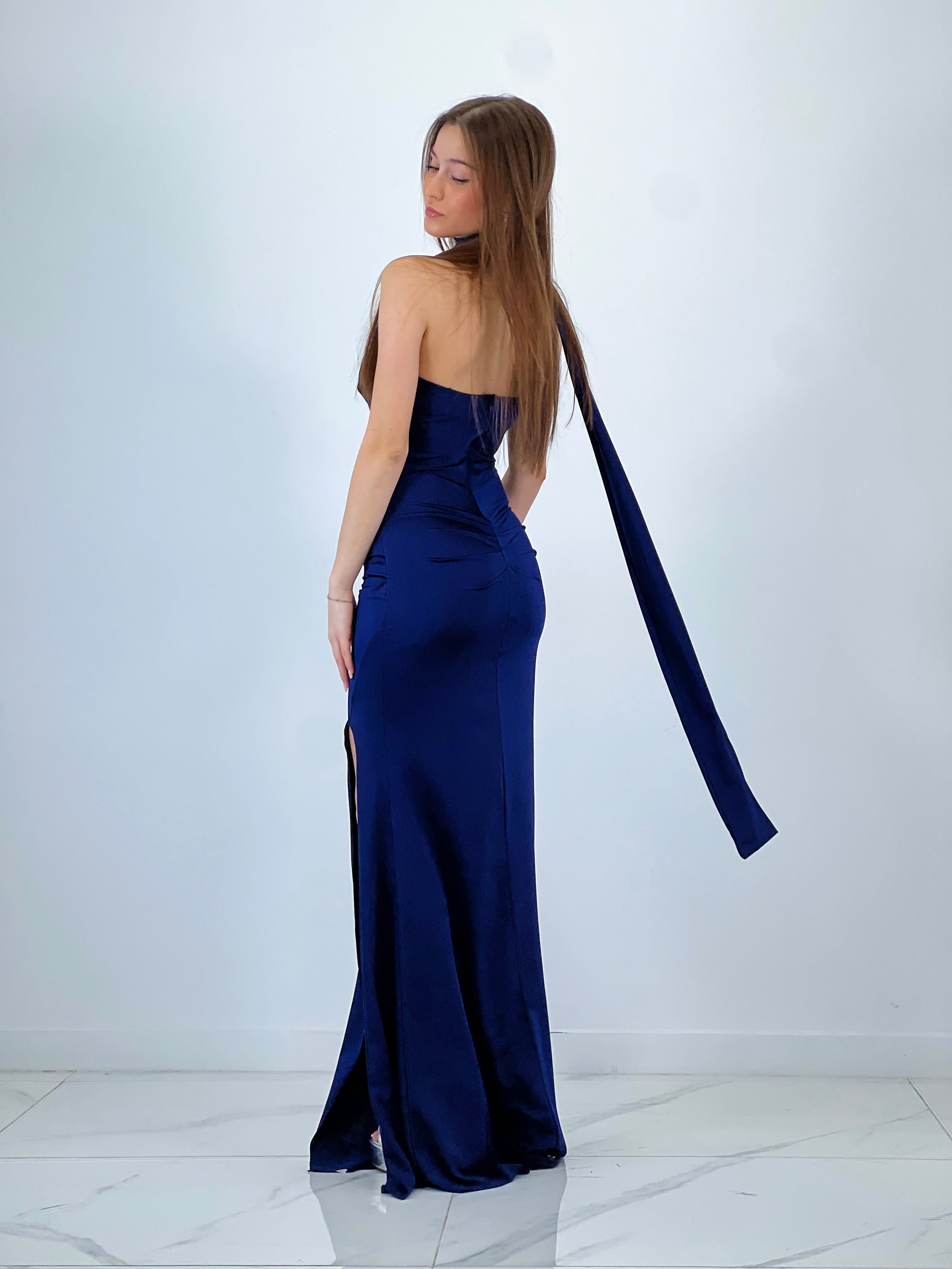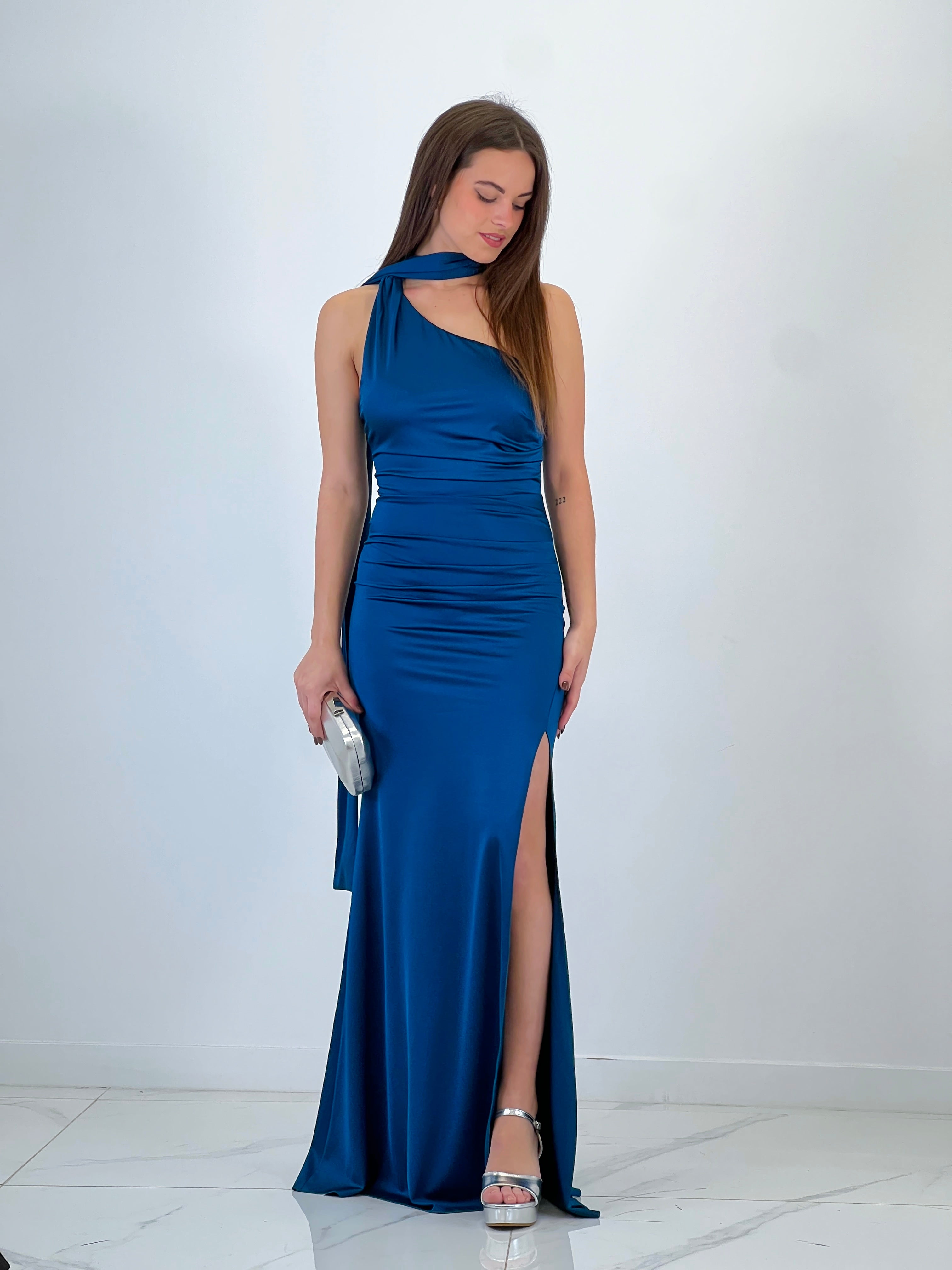Con su abertura lateral y elegante capa fular, te hará destacar en cualquier ocasión. Ideal para graduaciones y eventos formales.