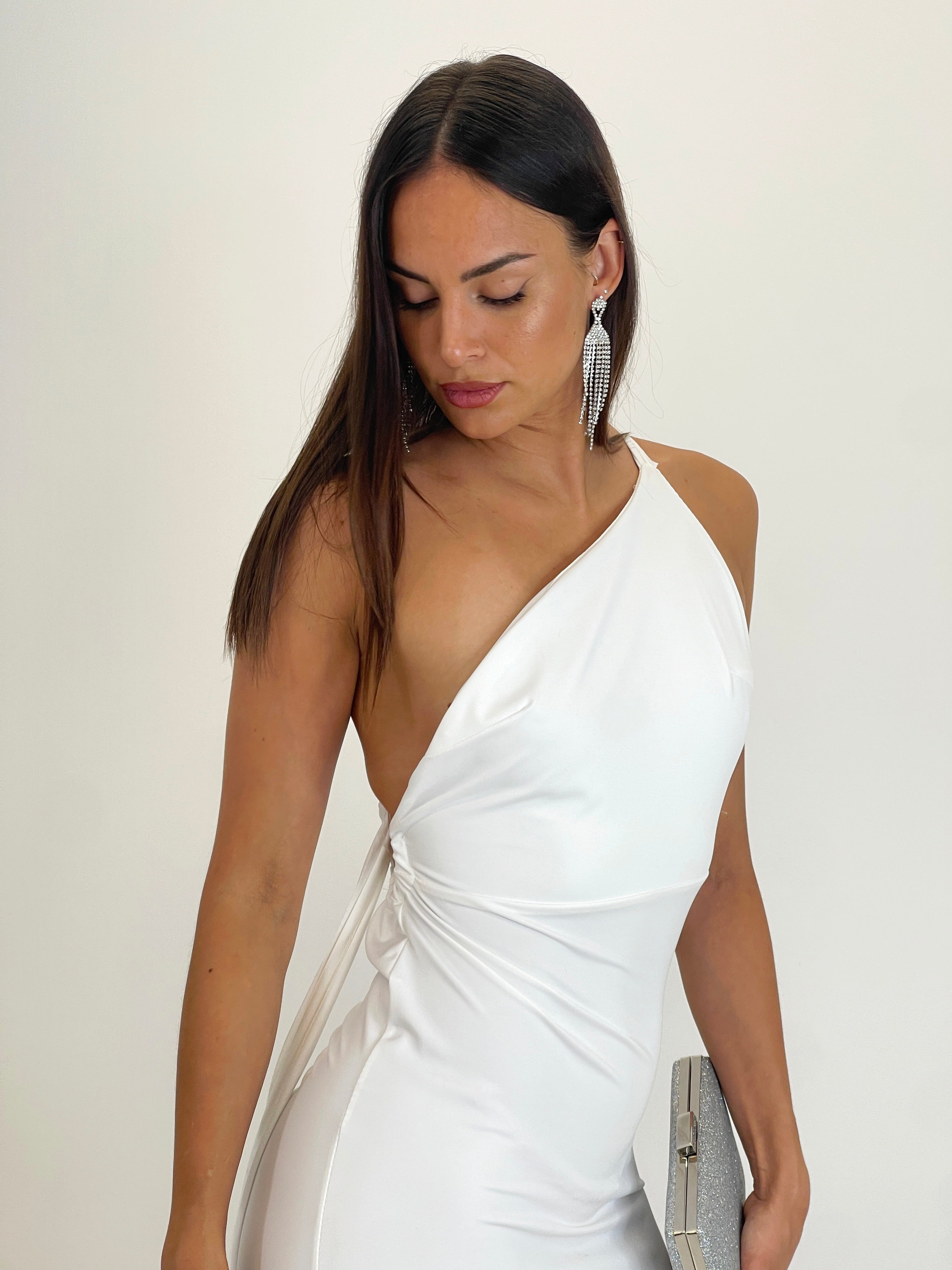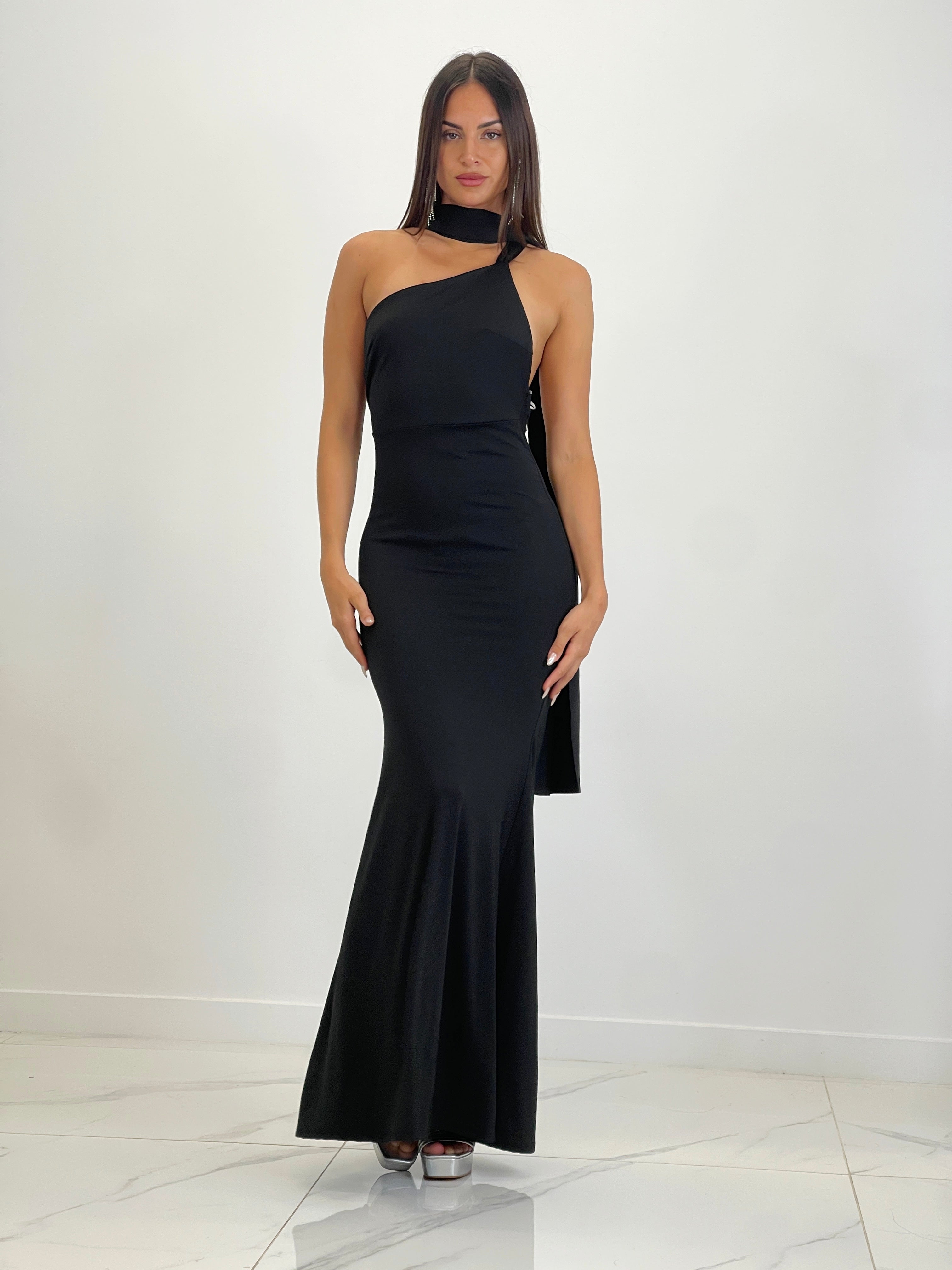 Este elegante vestido asimétrico es ideal para una ocasión especial. Su escote y cuello halter son perfectos para resaltar la elegancia de tu figura. Además, su corte de sirena y la anilla en la espalda descubierta le dan un toque moderno y seductor.