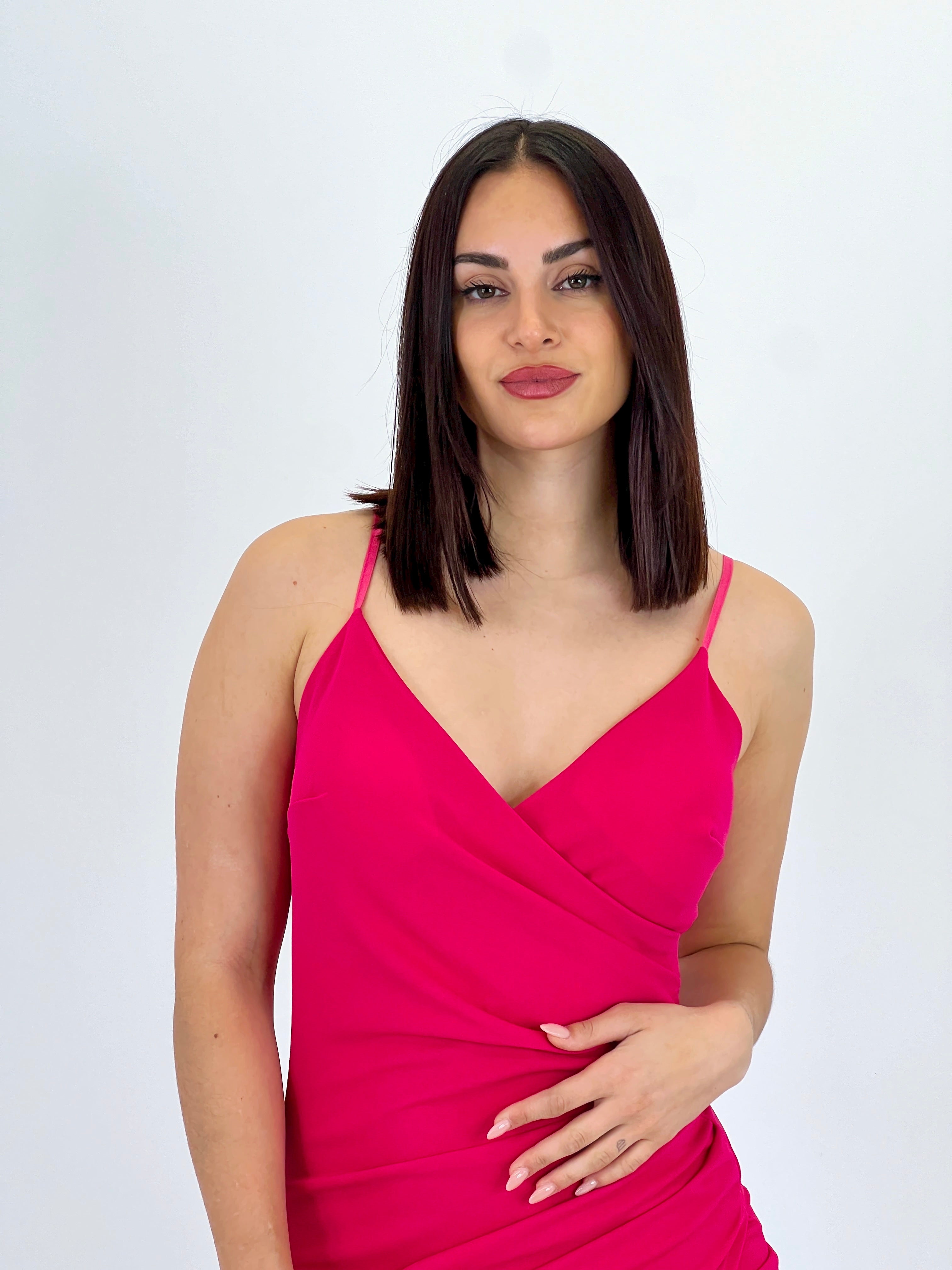 Este vestido te ofrece vestibilidad y elegancia al mismo tiempo. Con tejido de tul y un diseño de tirantes finos, escote cruzado y drapeado en la parte central, este vestido es perfecto para ocasiones especiales. Además, su amplia abertura hasta el muslo y efecto drapeado estilizan tu figura.