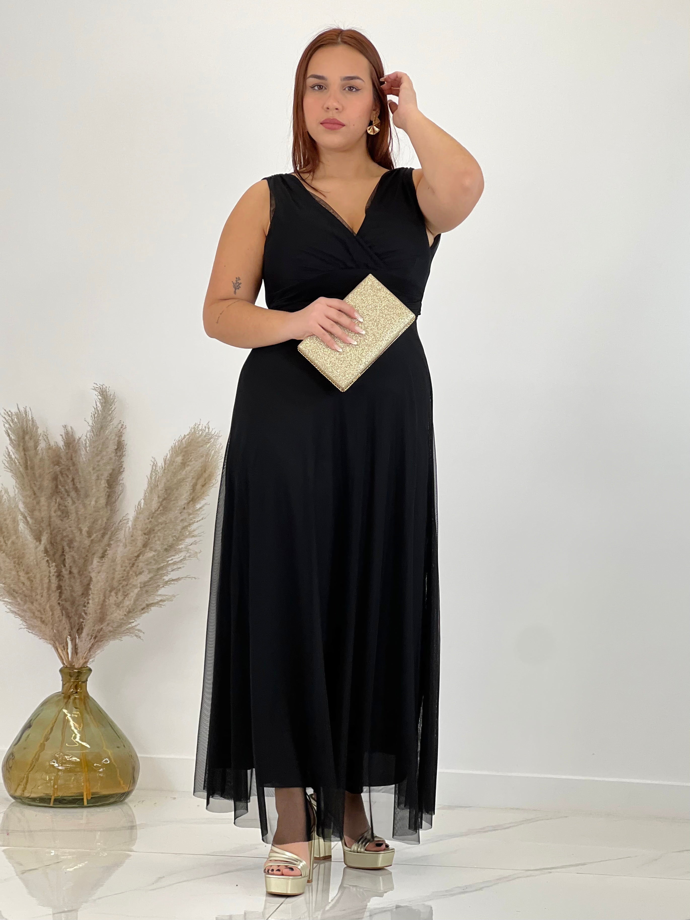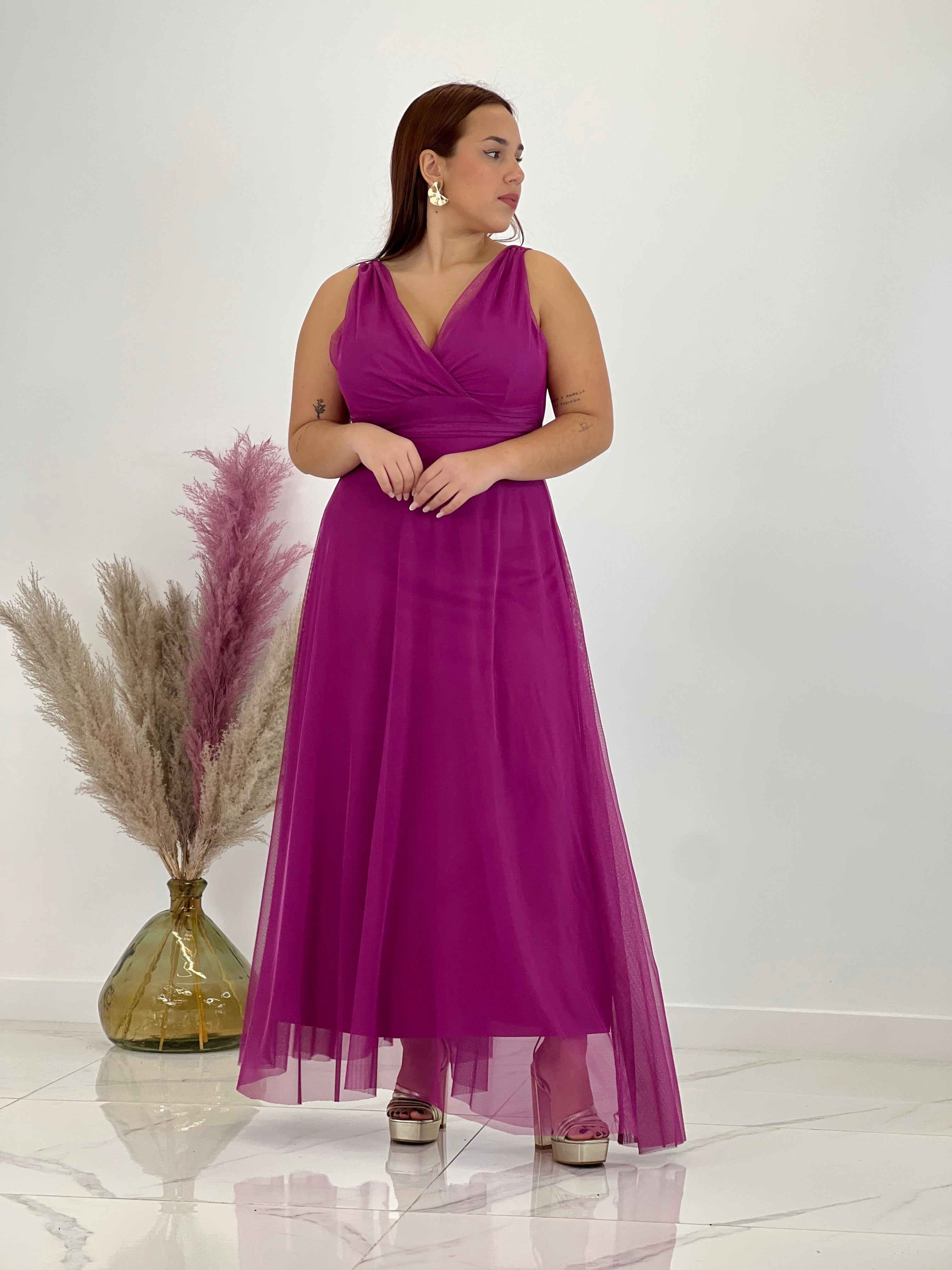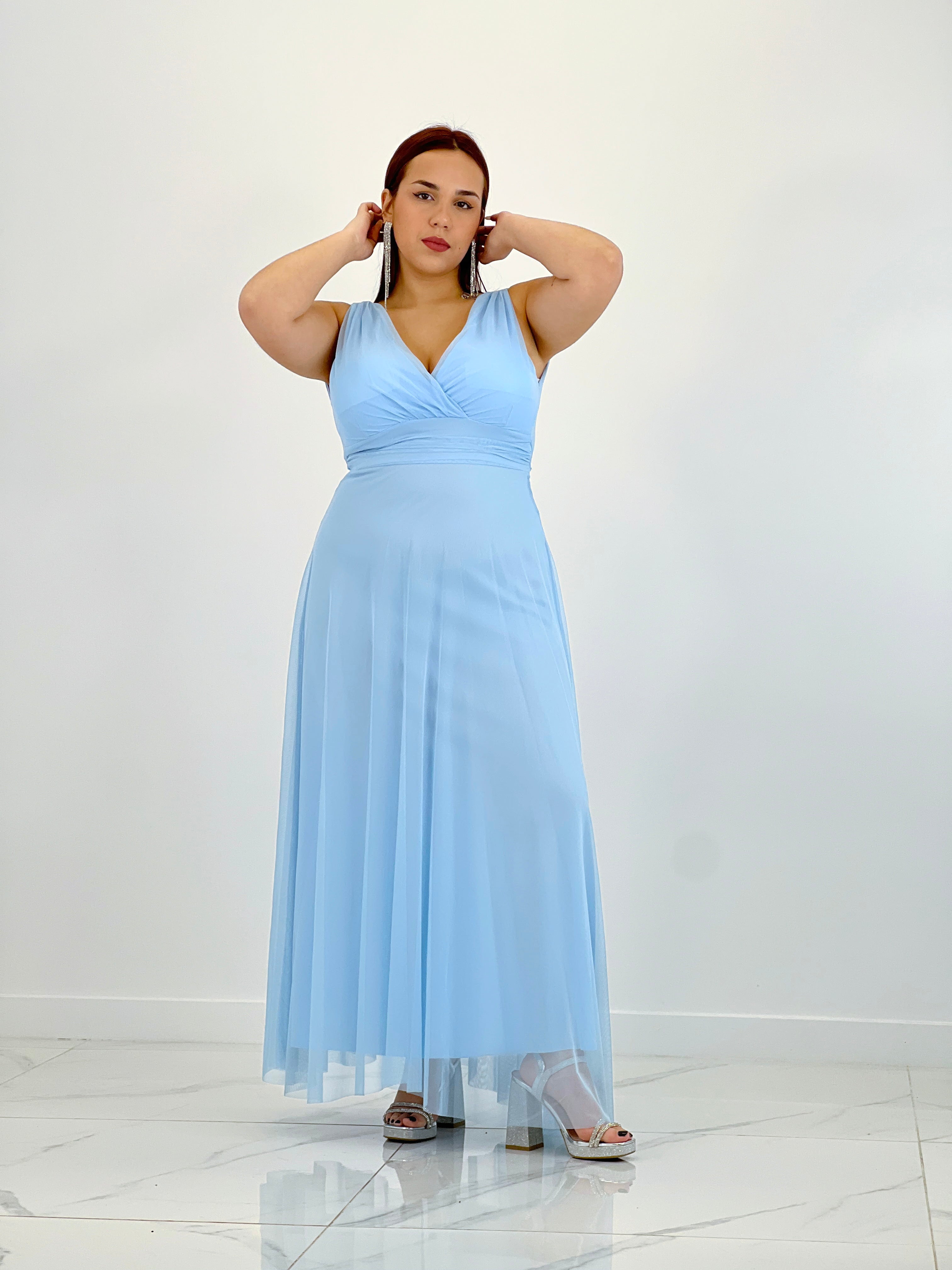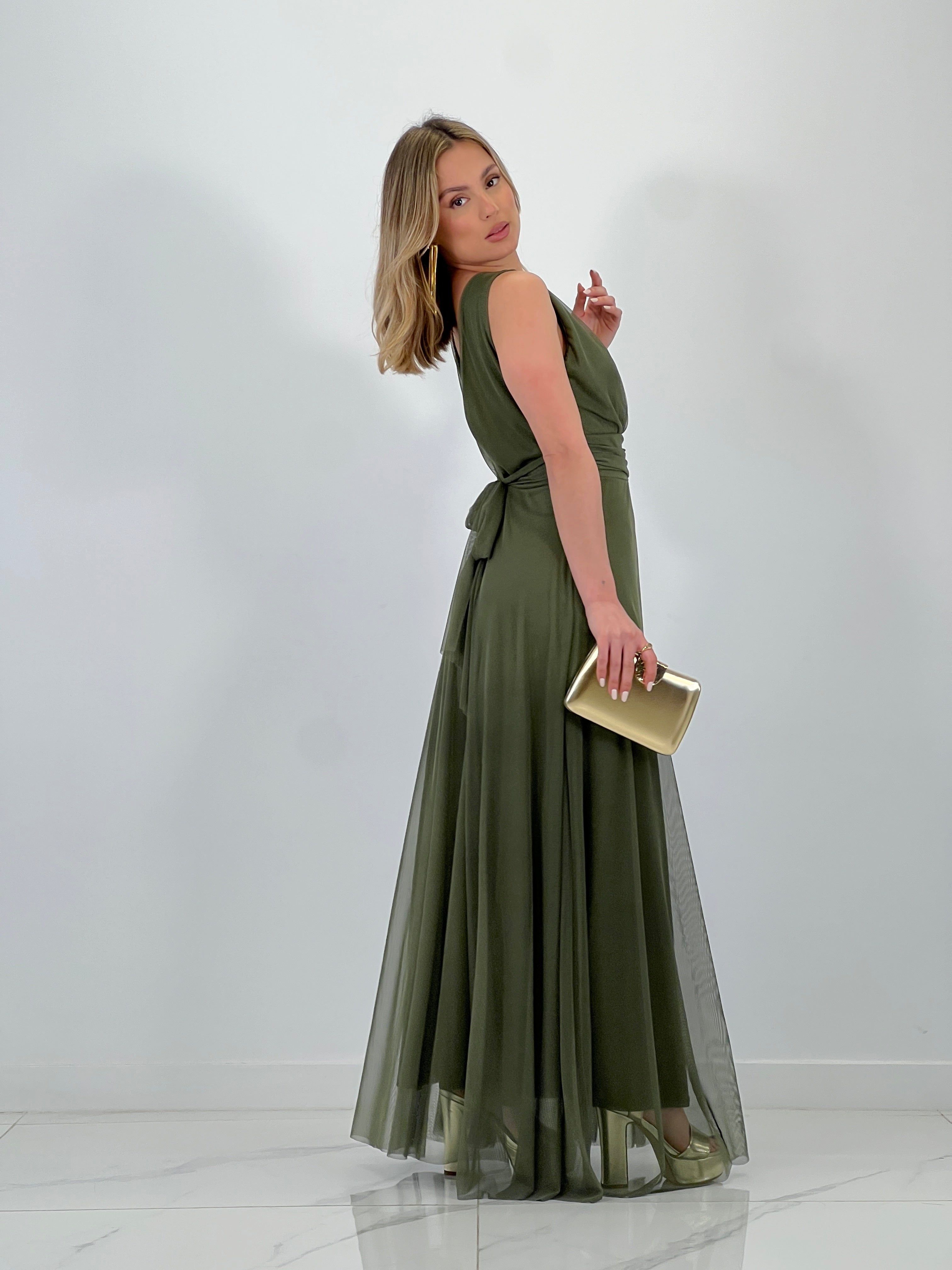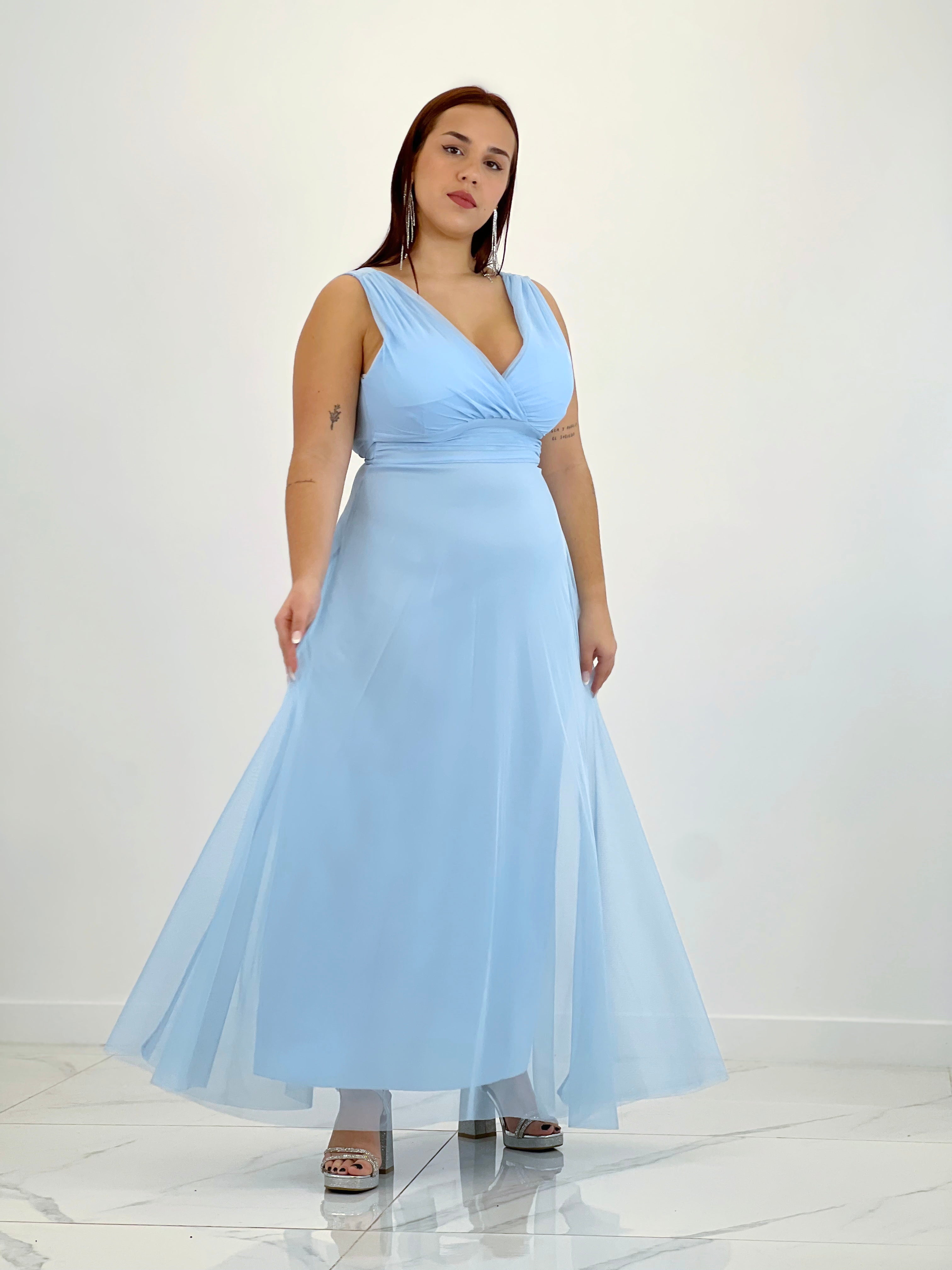Este vestido largo Alexandra está confeccionado en tul, ofreciendo un toque elegante y delicado. Su escote cruzado resalta el pecho, mientras que la cintura fruncida y la lazada en la espalda te permite ajustarlo a tu silueta. Además, cuenta con un forro interior para mayor comodidad.