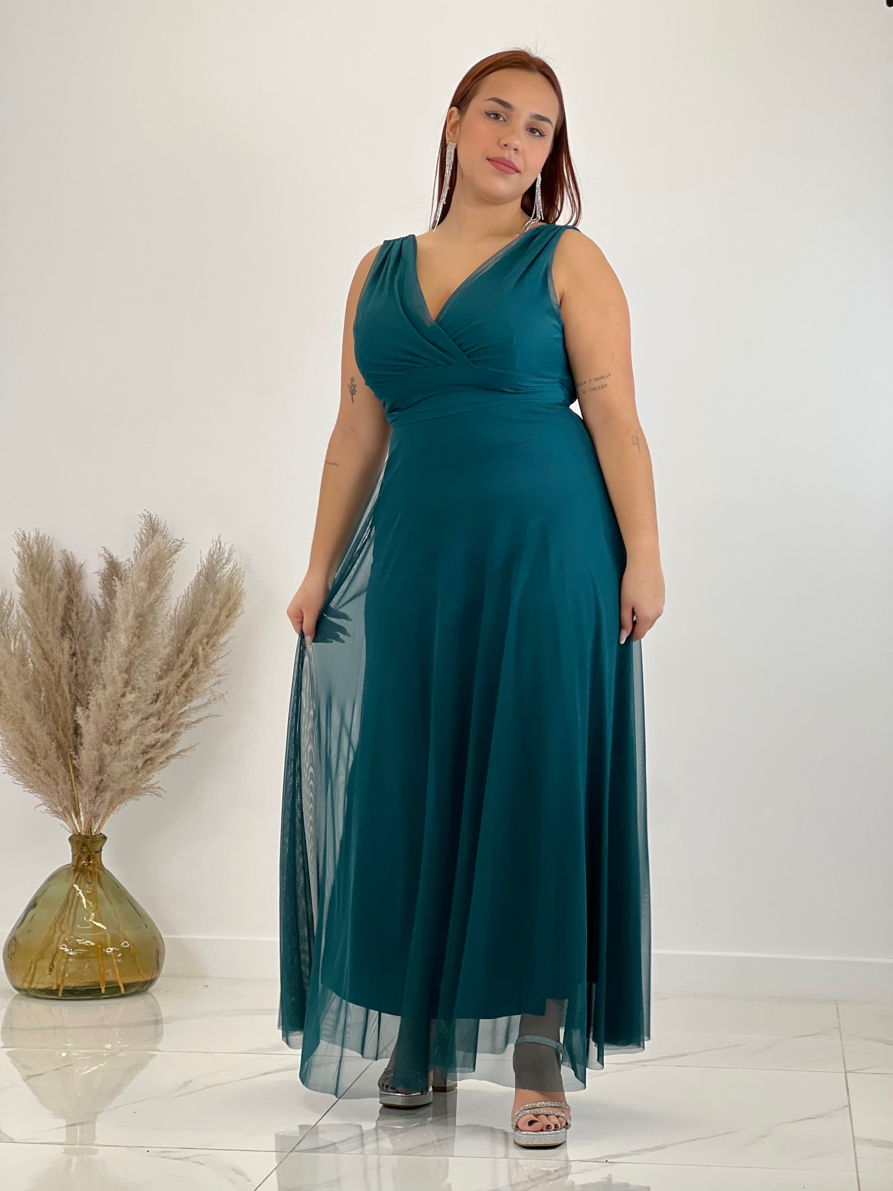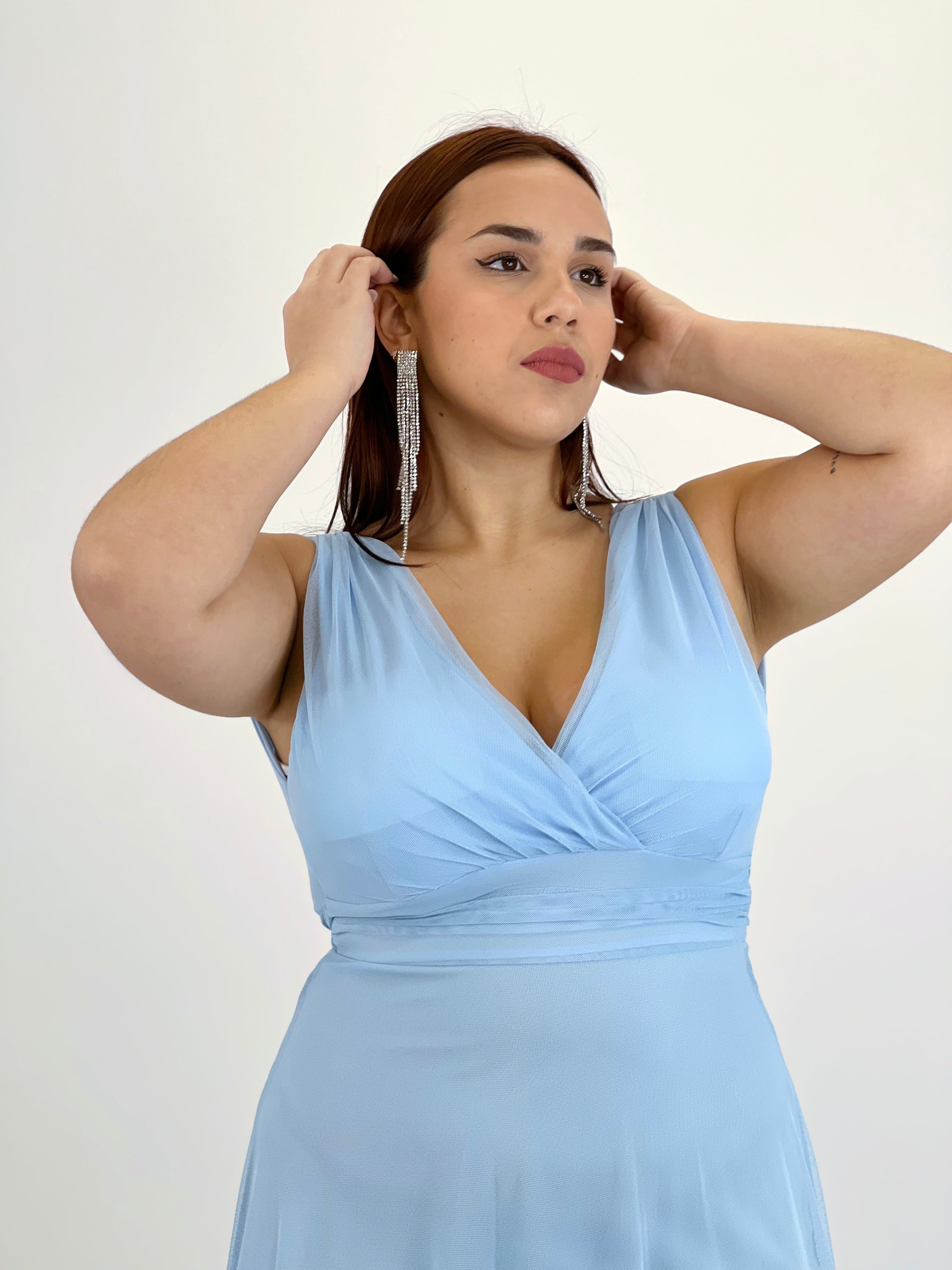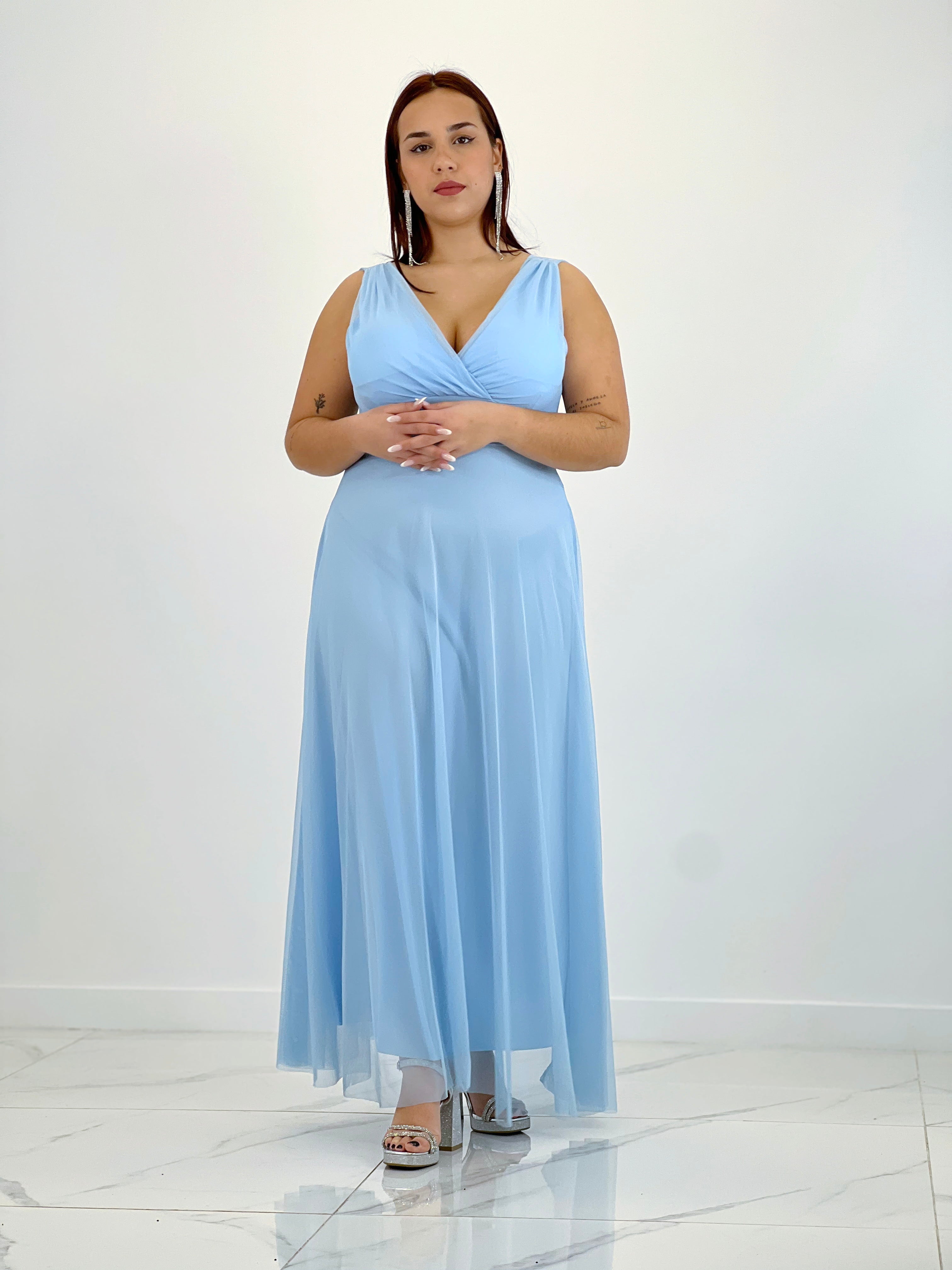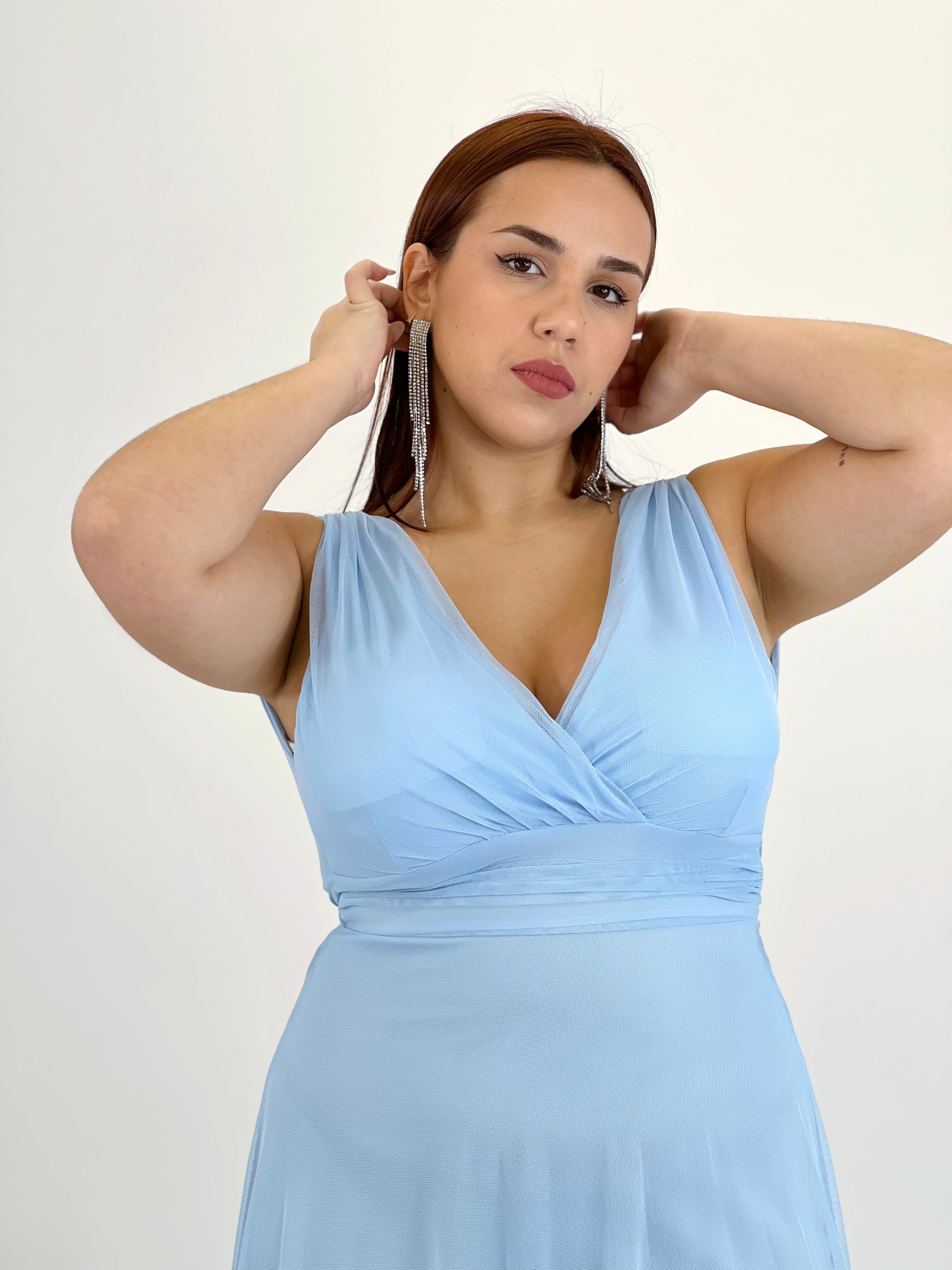 Este vestido largo Alexandra está confeccionado en tul, ofreciendo un toque elegante y delicado. Su escote cruzado resalta el pecho, mientras que la cintura fruncida y la lazada en la espalda te permite ajustarlo a tu silueta. Además, cuenta con un forro interior para mayor comodidad.