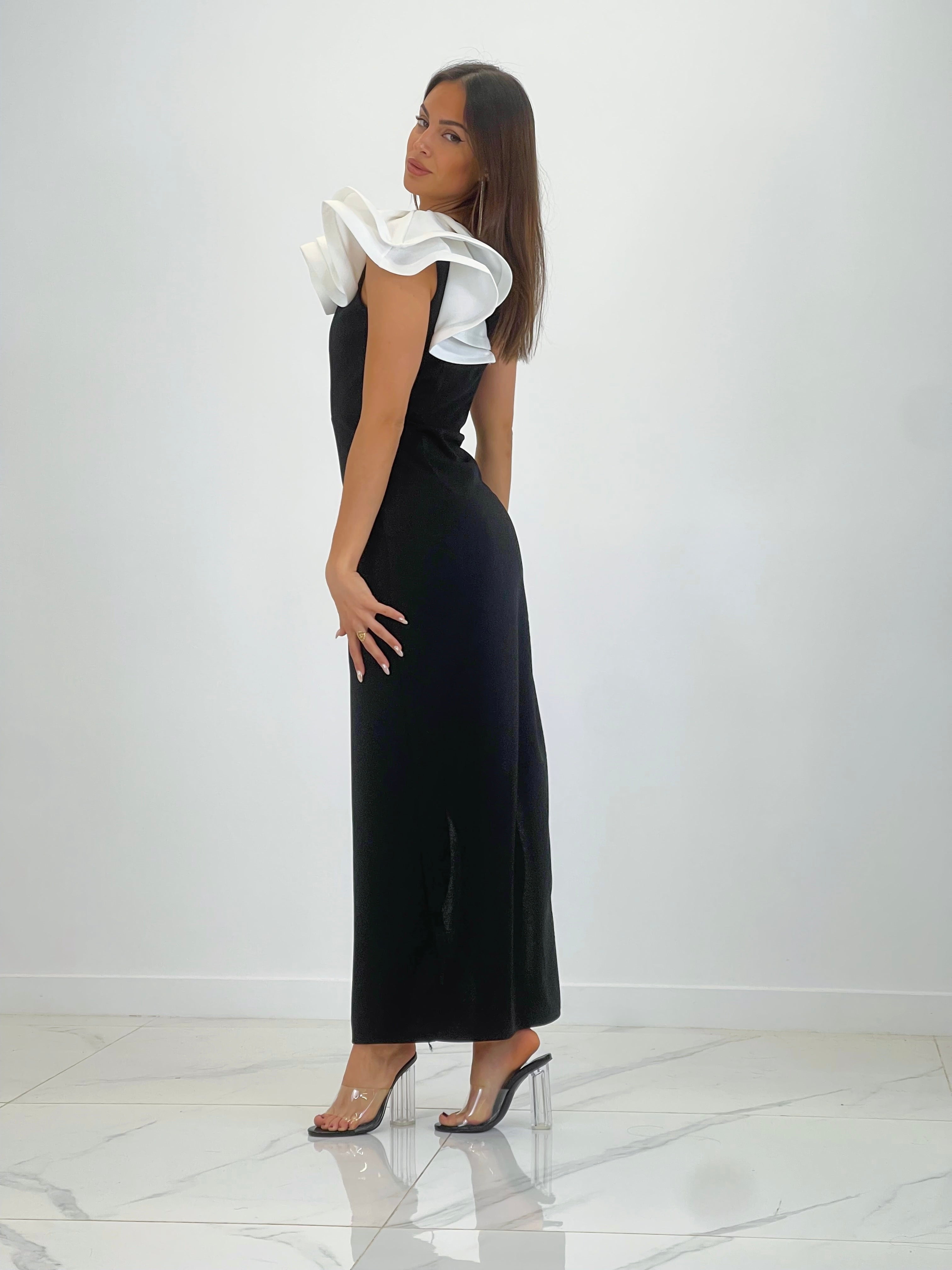 El Vestido ceremonia Amelia es una elegante y moderna opción para cualquier ceremonia. Con su diseño asimétrico y un volante en el hombro, este vestido largo destaca por su estilo único y sofisticado. Además, su corte pronunciado en la pierna te brinda un aspecto elegante y femenino.