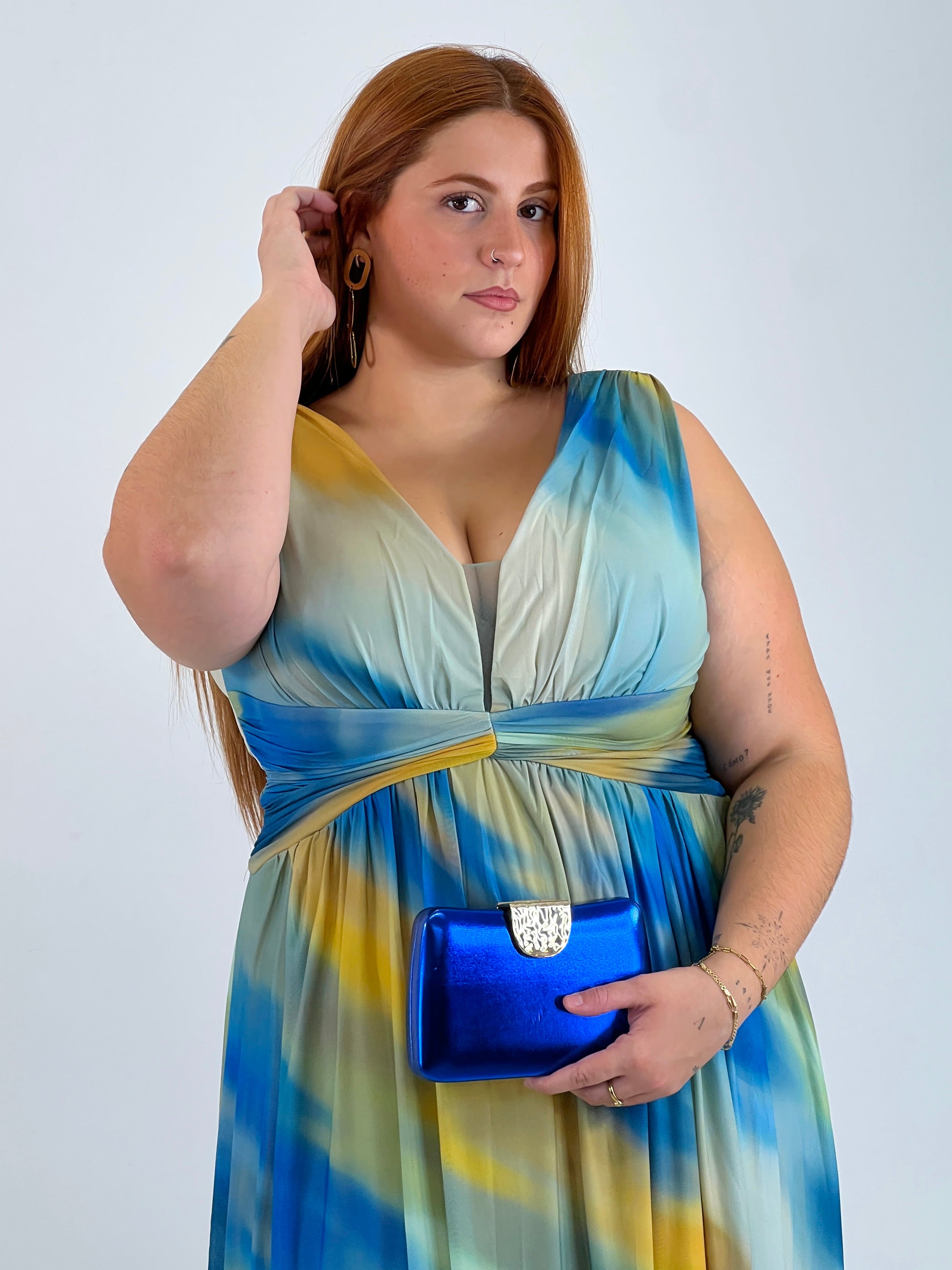 Look elegant and comfortable at any ceremony in this plus-size maxi dress. Its water-print print and gathered underbust will enhance your figure. Made of soft, flowing fabric, it features an invisible back zipper closure.