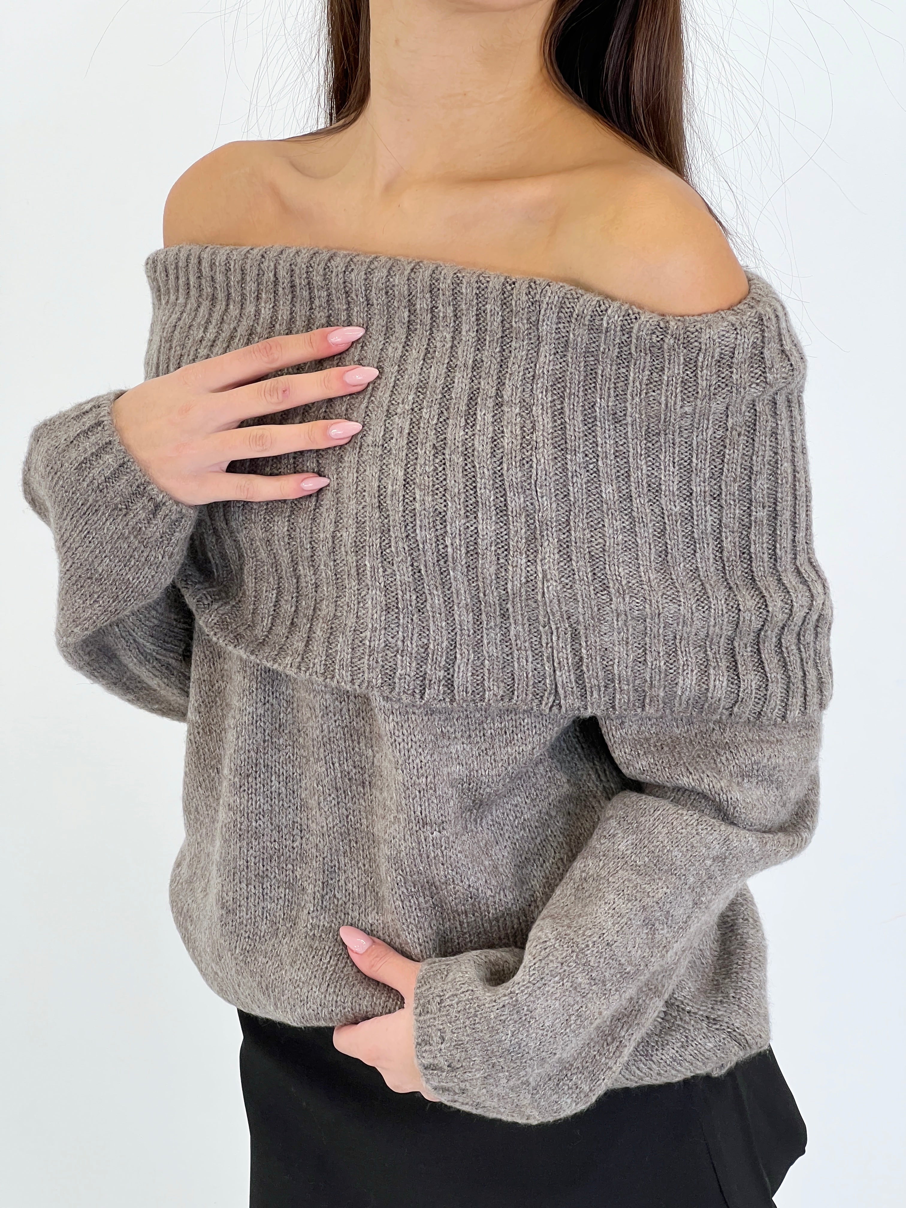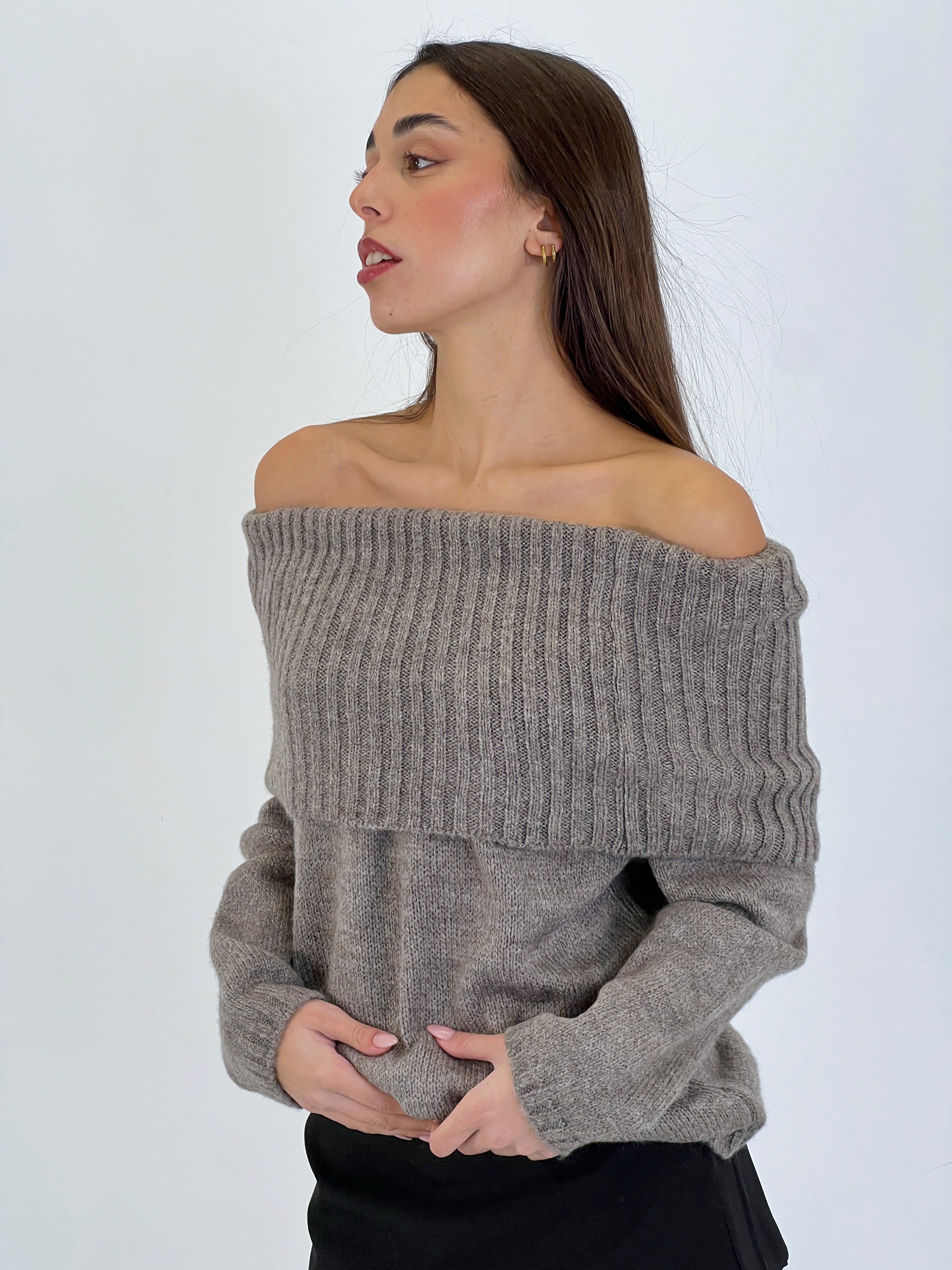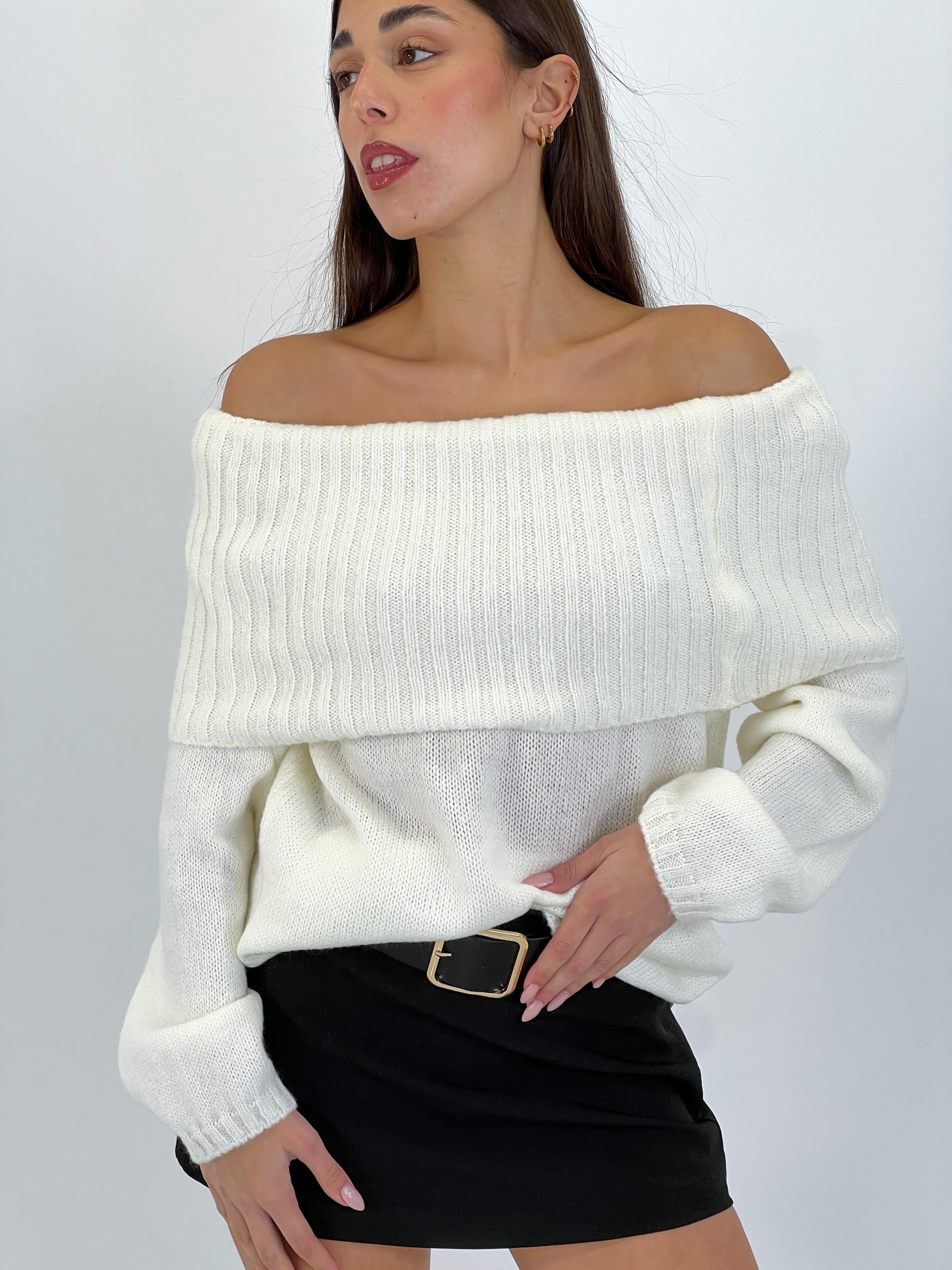 Knit sweater with a diamond design that plays with volumes and textures. Generous boat neckline that elegantly and boldly exposes the shoulders. Perfect for those looking to break the monotony without sacrificing comfort. Combines graphic sophistication with a silhouette that dares to stand out. Ideal for creating modern and personality-filled looks.