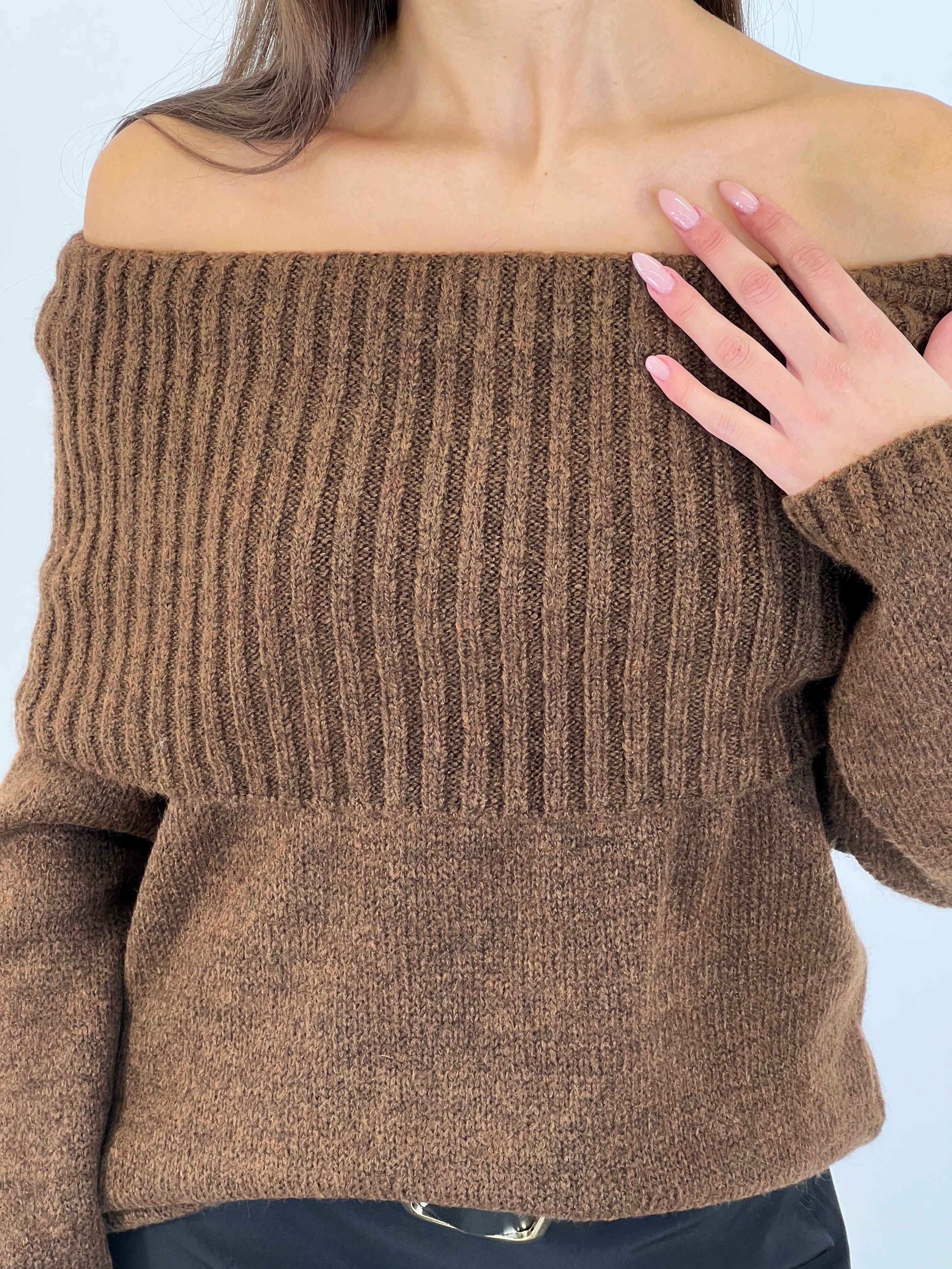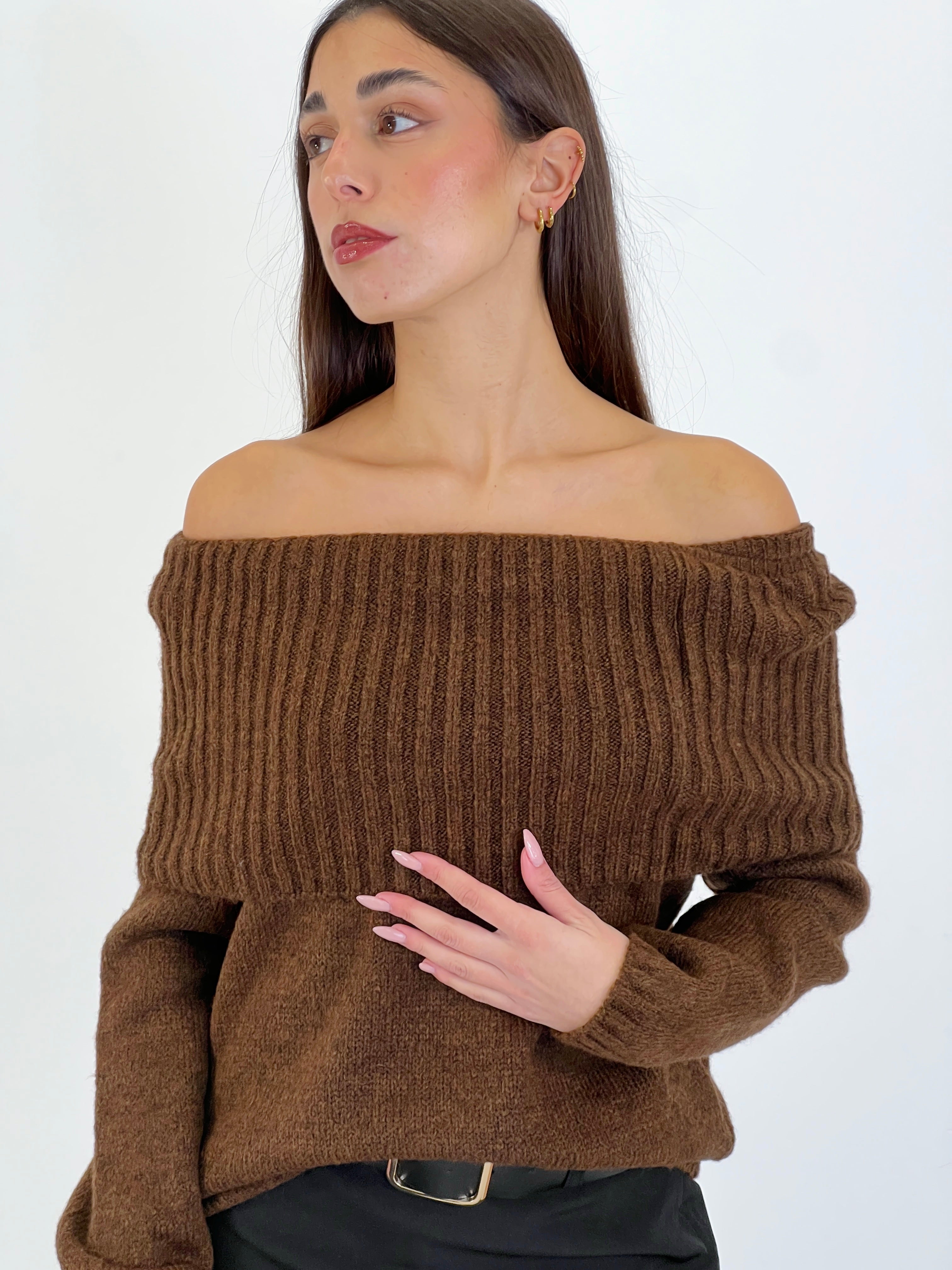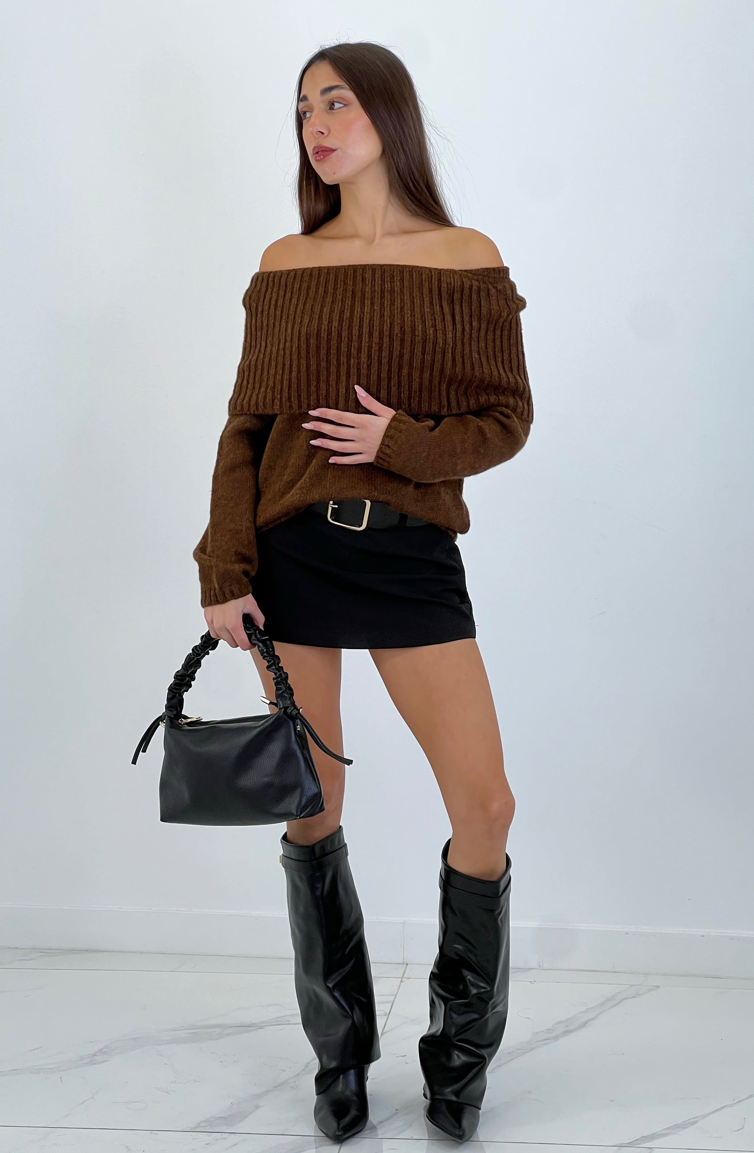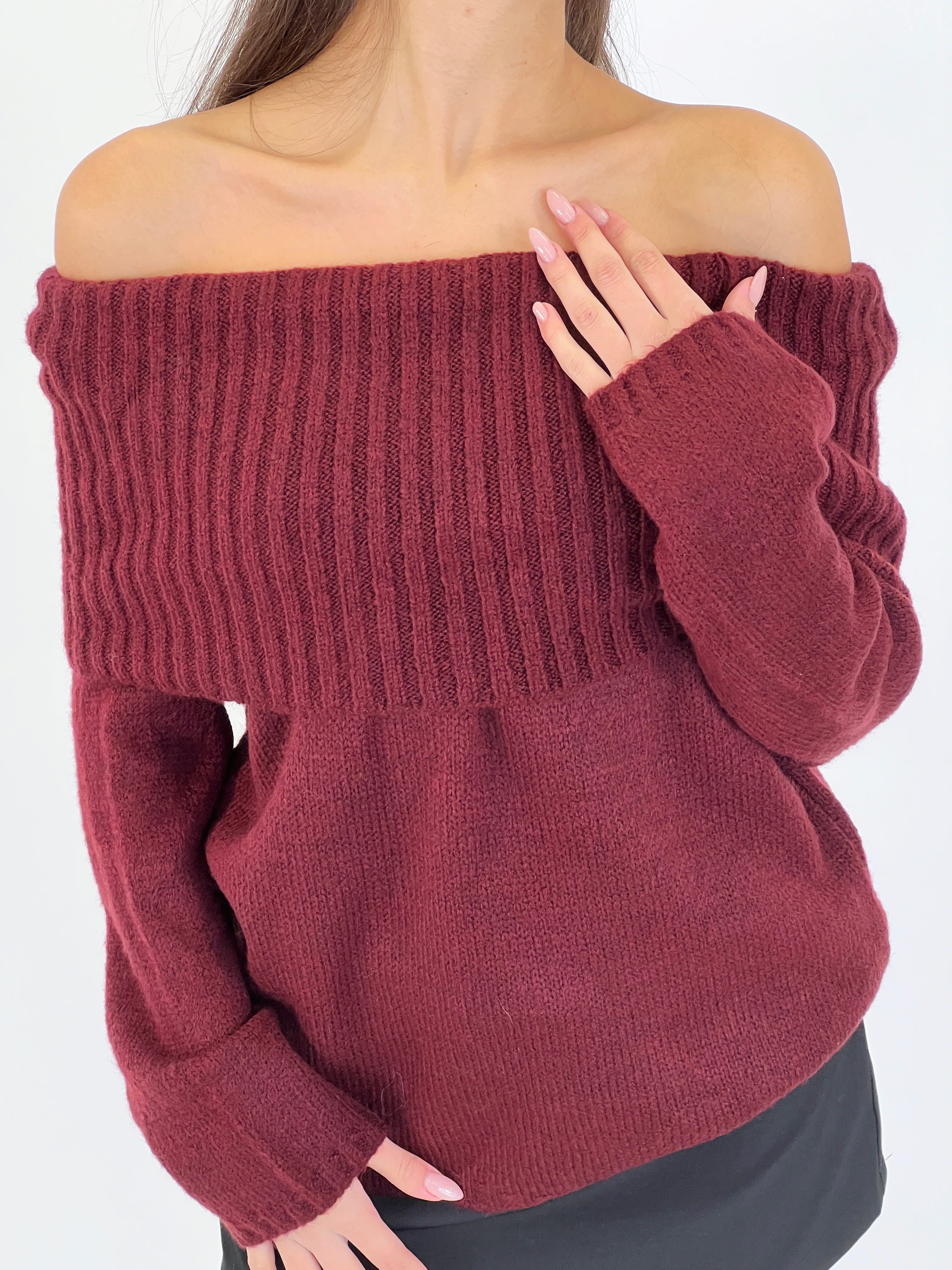 Knit sweater with a diamond design that plays with volumes and textures. Generous boat neckline that elegantly and boldly exposes the shoulders. Perfect for those looking to break the monotony without sacrificing comfort. Combines graphic sophistication with a silhouette that dares to stand out. Ideal for creating modern and personality-filled looks.