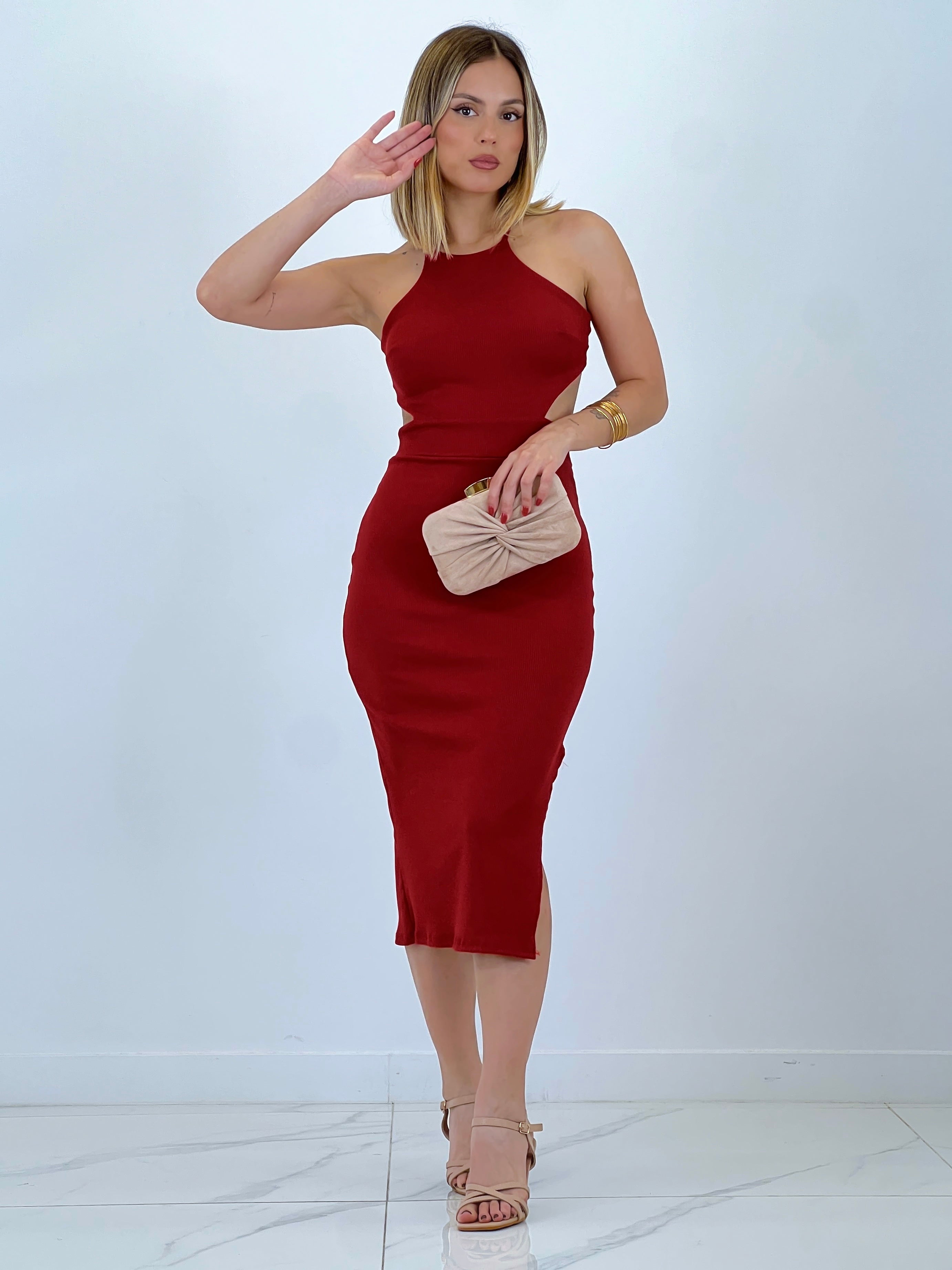 This elegant midi dress features a ribbed design and a flattering halter neck with a bow detail at the open back.