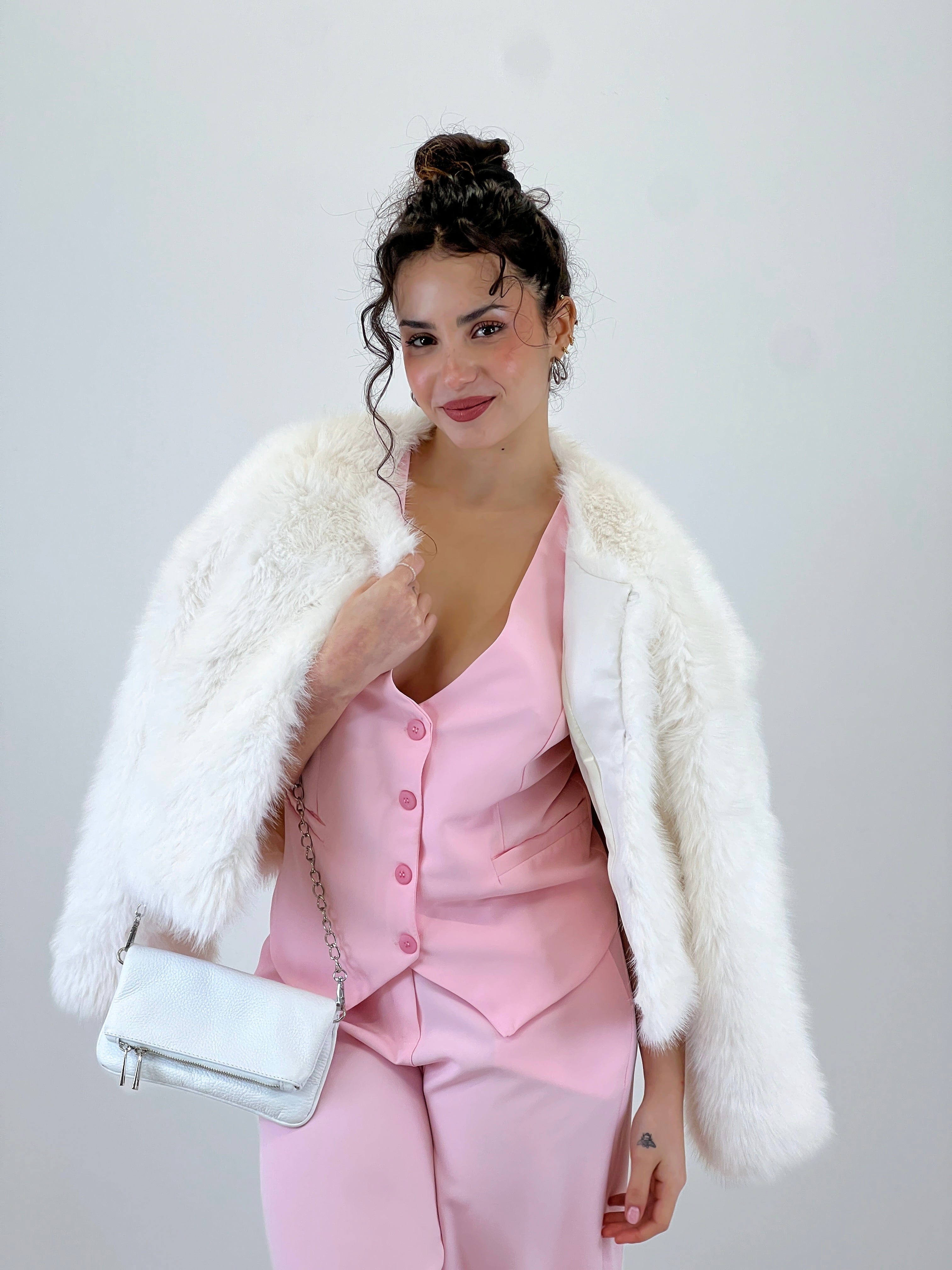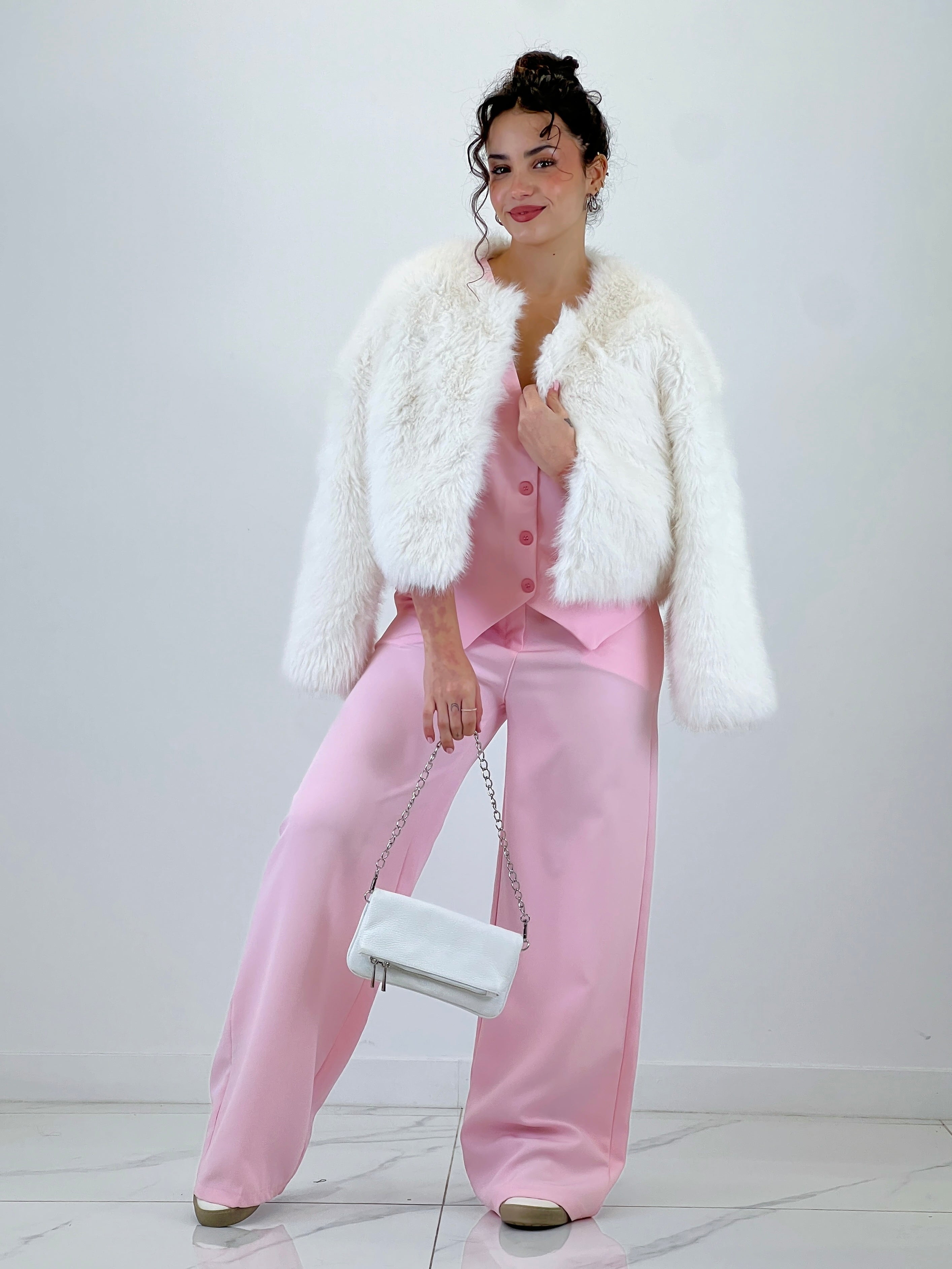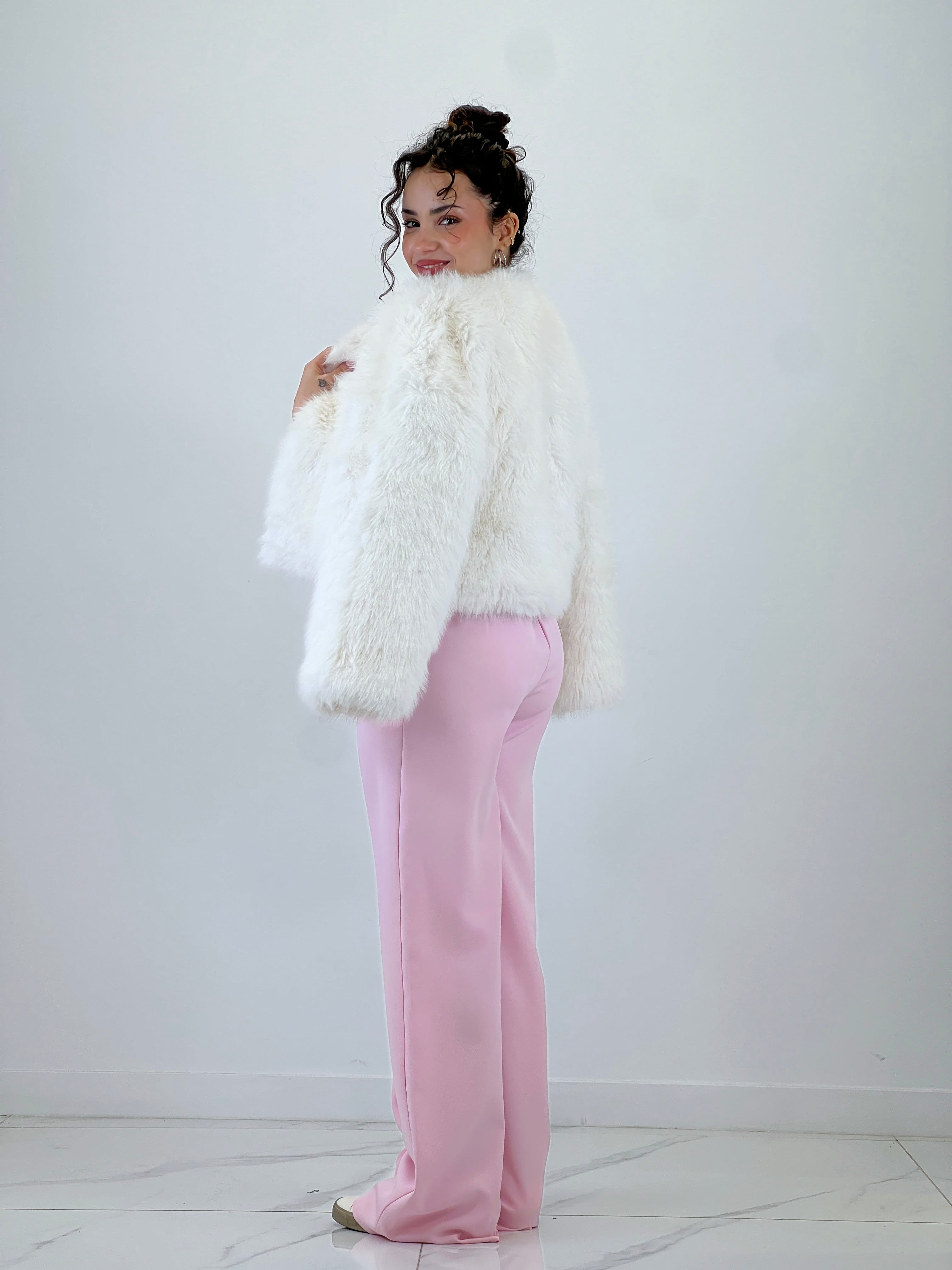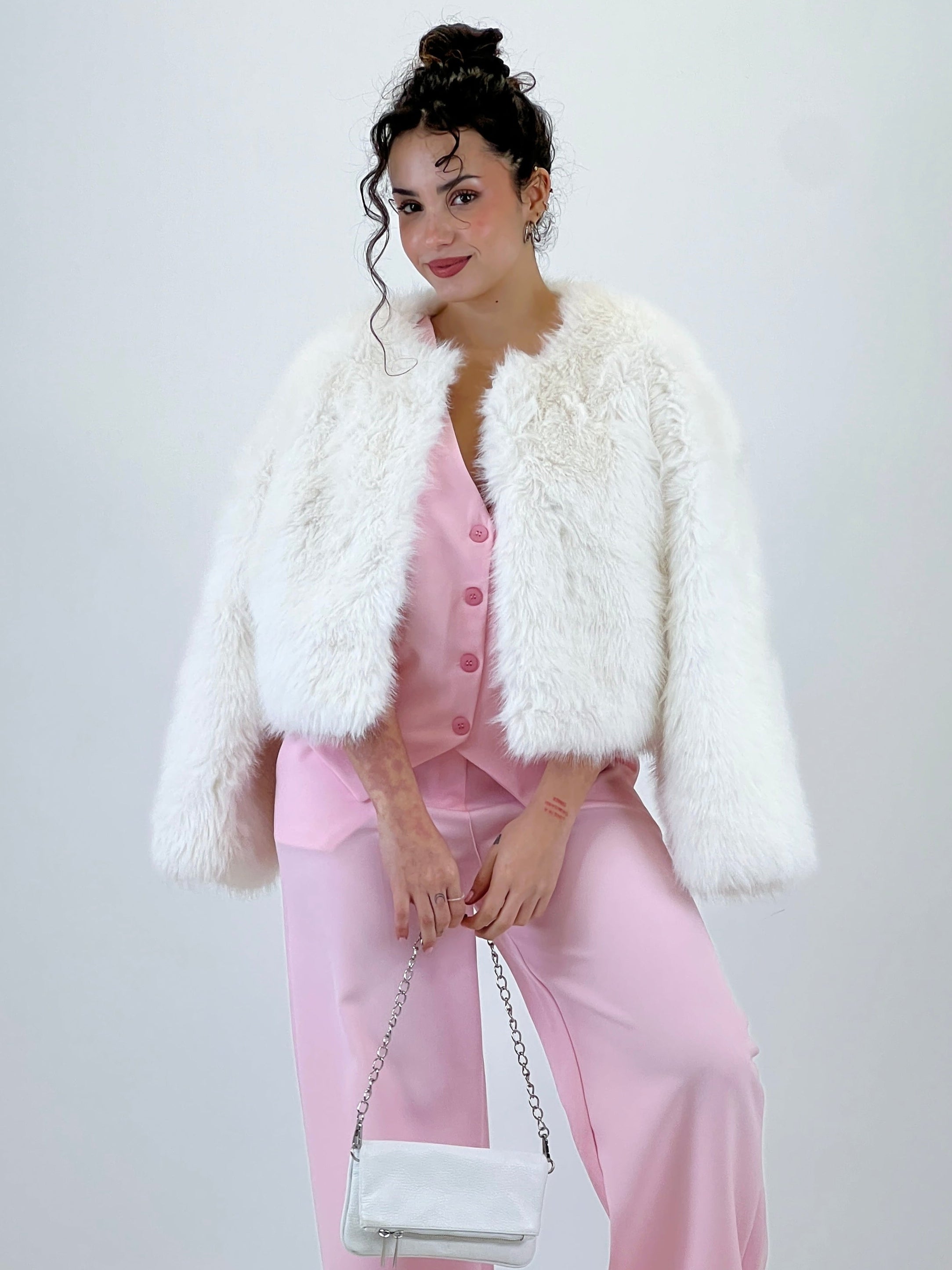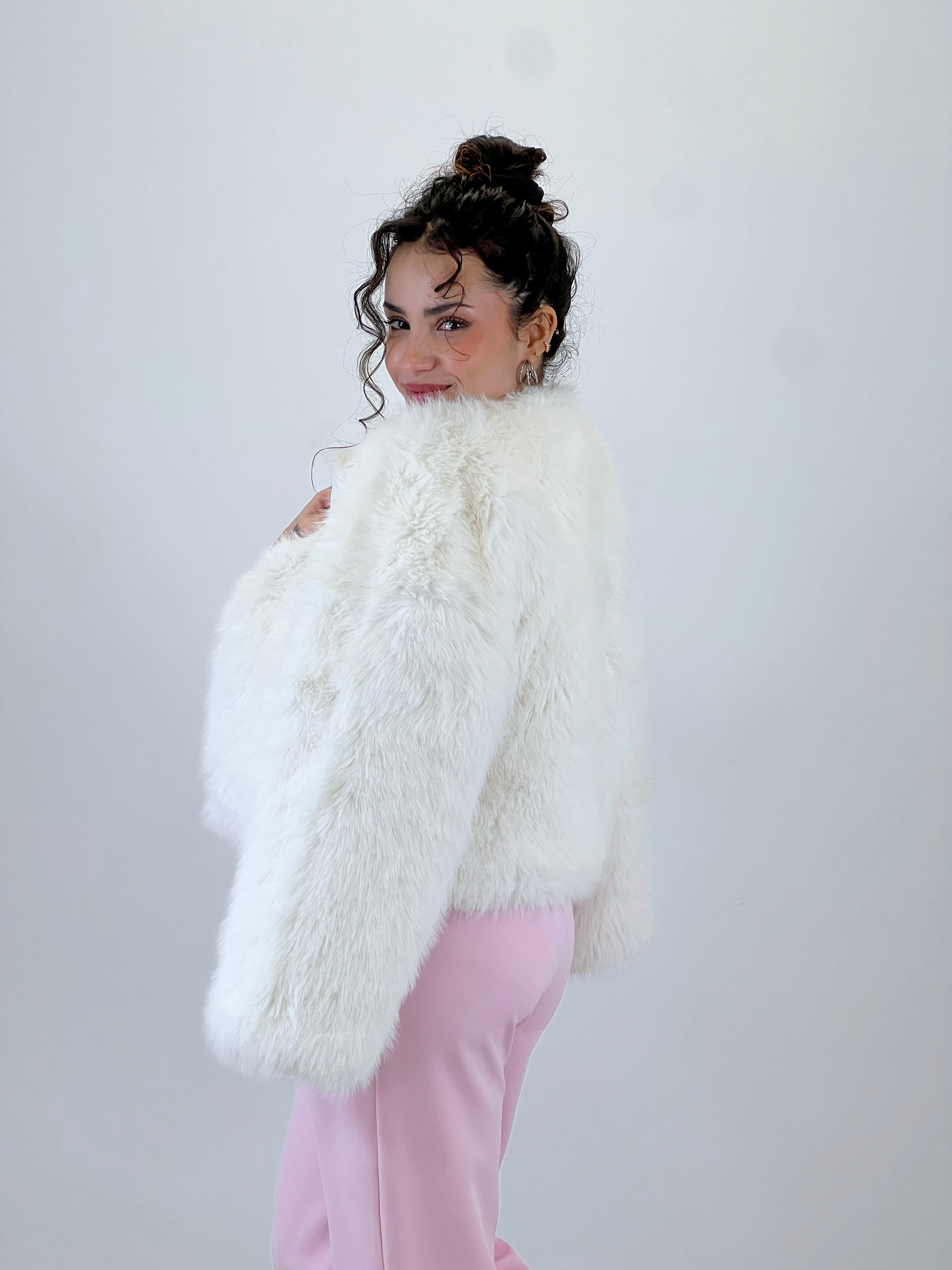 Un abrigo de pelo corto que irradia elegancia y sofisticación. Perfecto para cualquier ocasión, desde ceremonias hasta para la novia en su gran día. Con cuello redondo y mangas largas, este abrigo cuenta con bolsillos laterales ocultos y cierre frontal con corchetes ocultos para un look pulido.