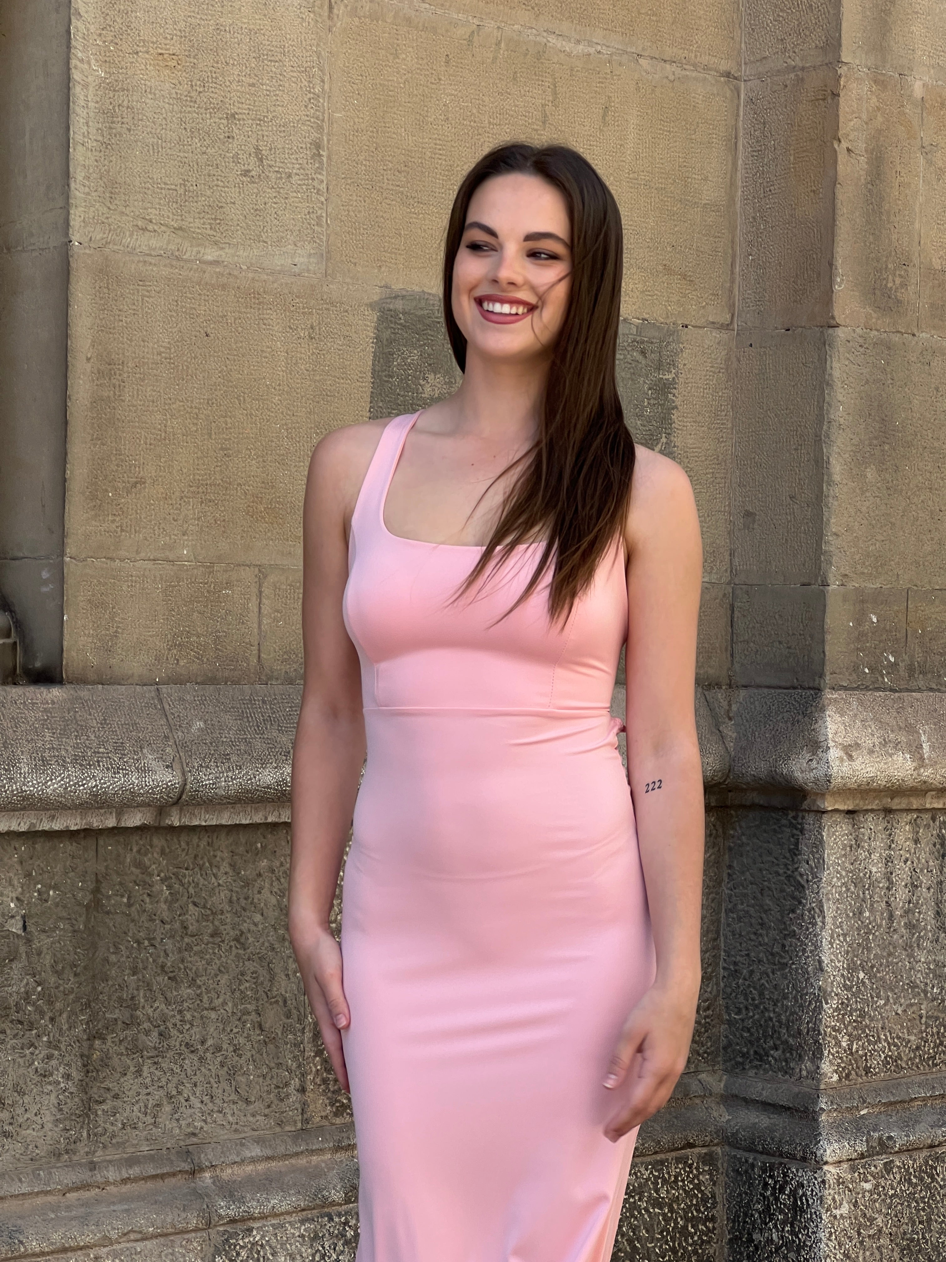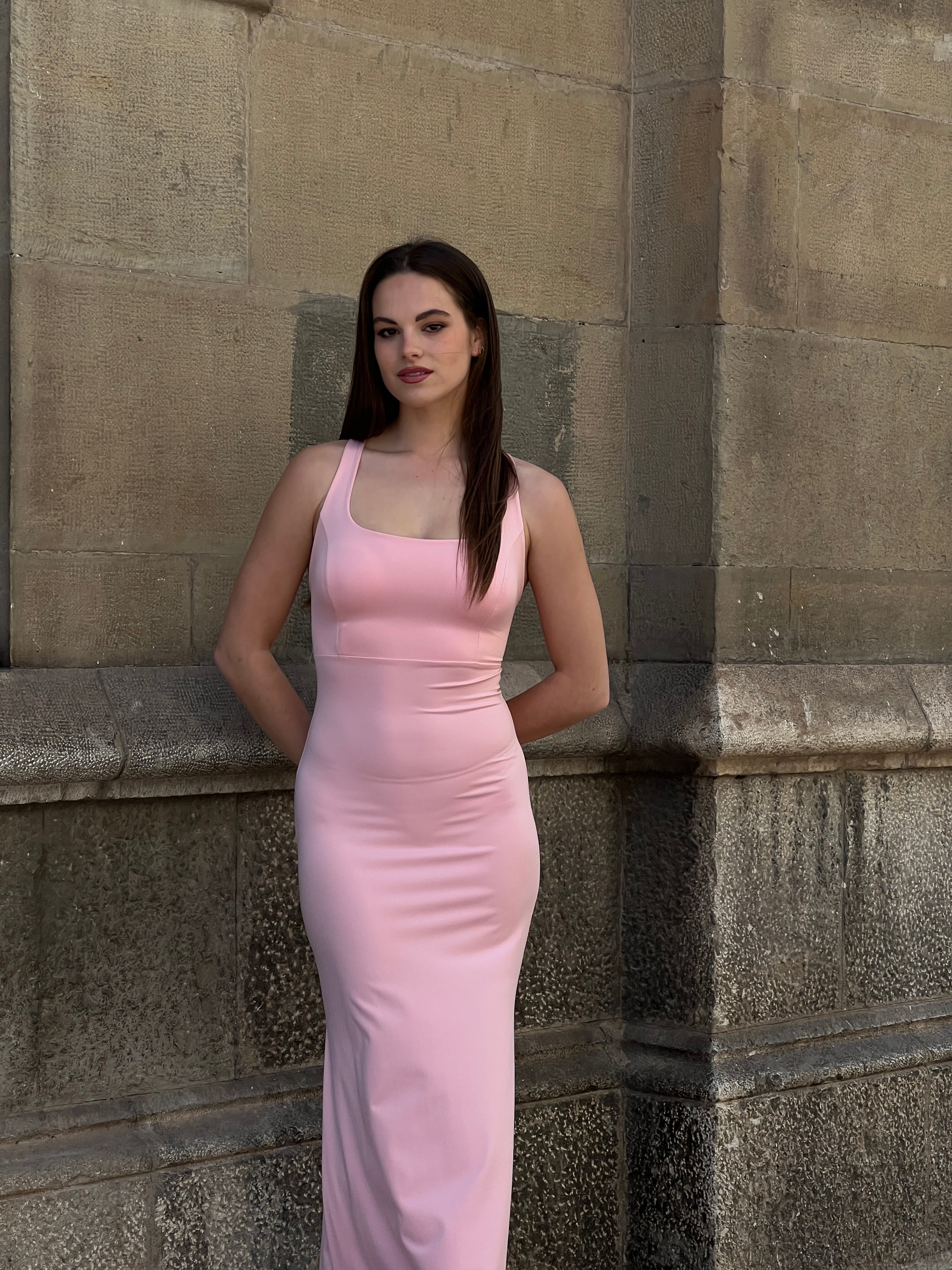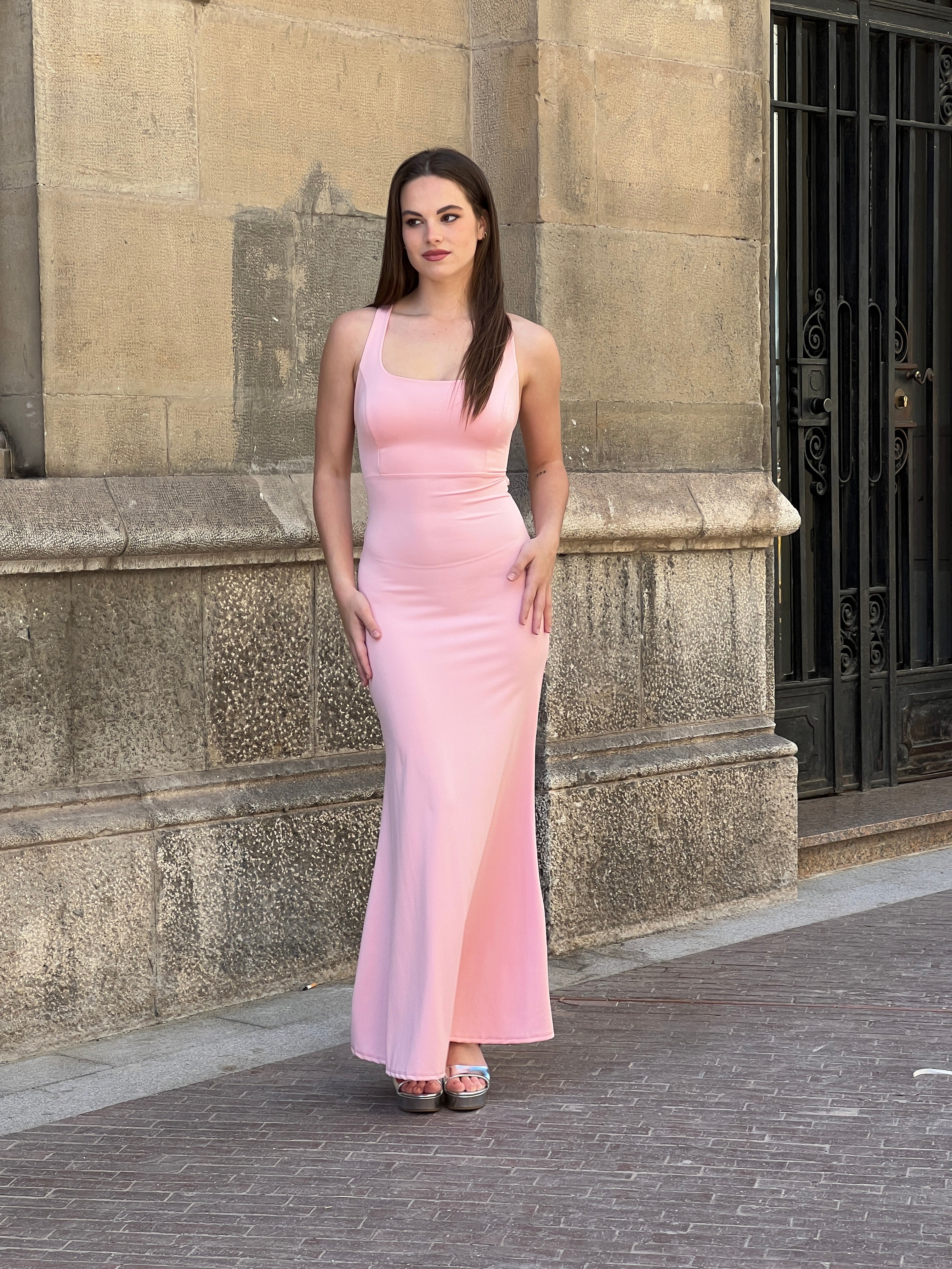 Vestido largo Clara con escote cuadrado y espalda cruzada. Tirantes que proporcionan comodidad y seguridad. Confeccionado en licra elástica que se adapta perfectamente al cuerpo, con bajo acampanado que añade movimiento y elegancia. Ideal para eventos especiales o salidas nocturnas donde deseas lucir sofisticada y cómoda.