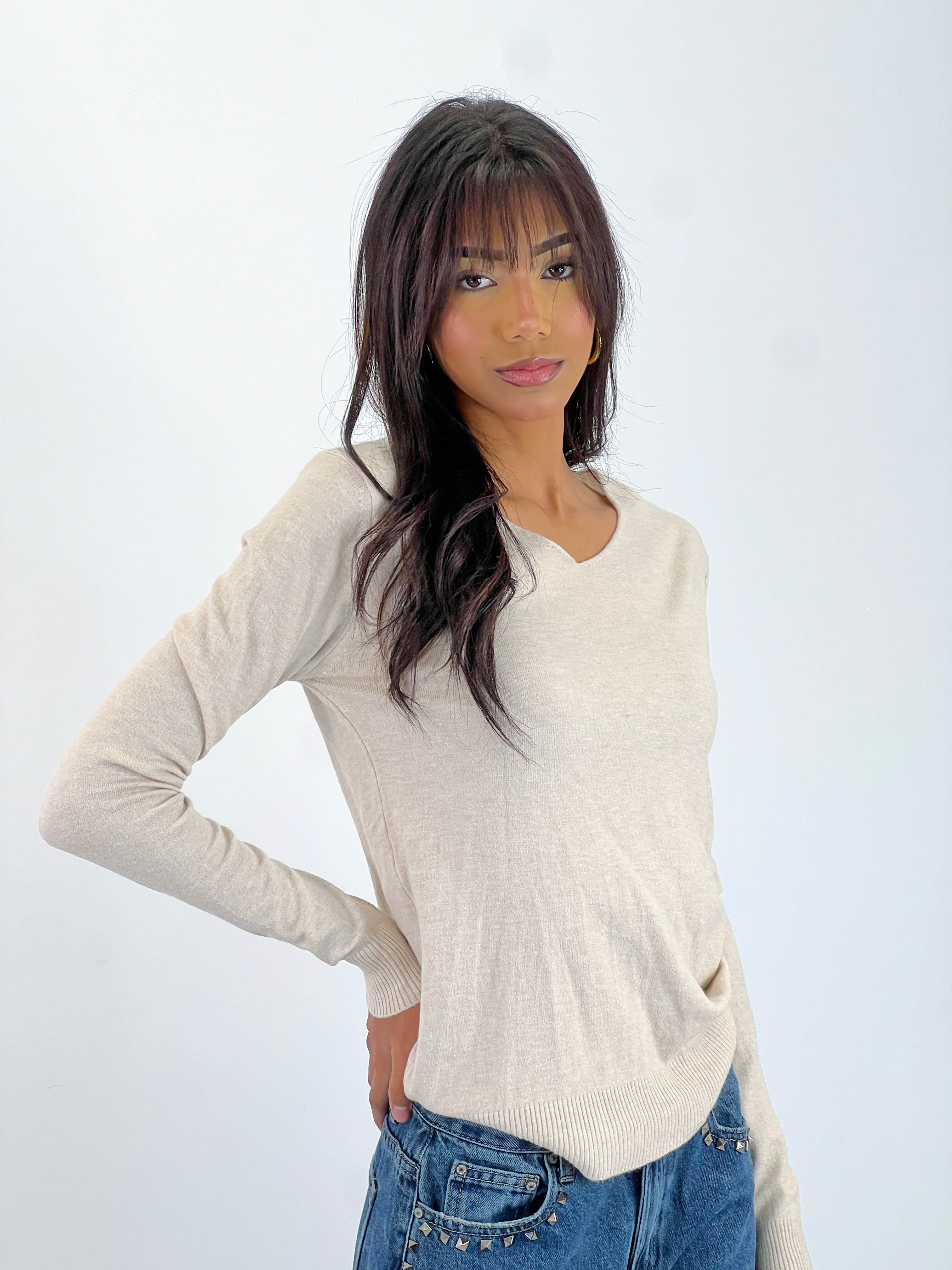 Este jersey de punto básico con cuello pico ofrece un ajuste cómodo gracias a su tejido elástico. Su diseño incluye un bajo acabado en rib que proporciona durabilidad y un acabado cuidadoso. Perfecto para combinar en cualquier ocasión, su corte y materiales garantizan facilidad de movimiento y un estilo clásico y versátil.
