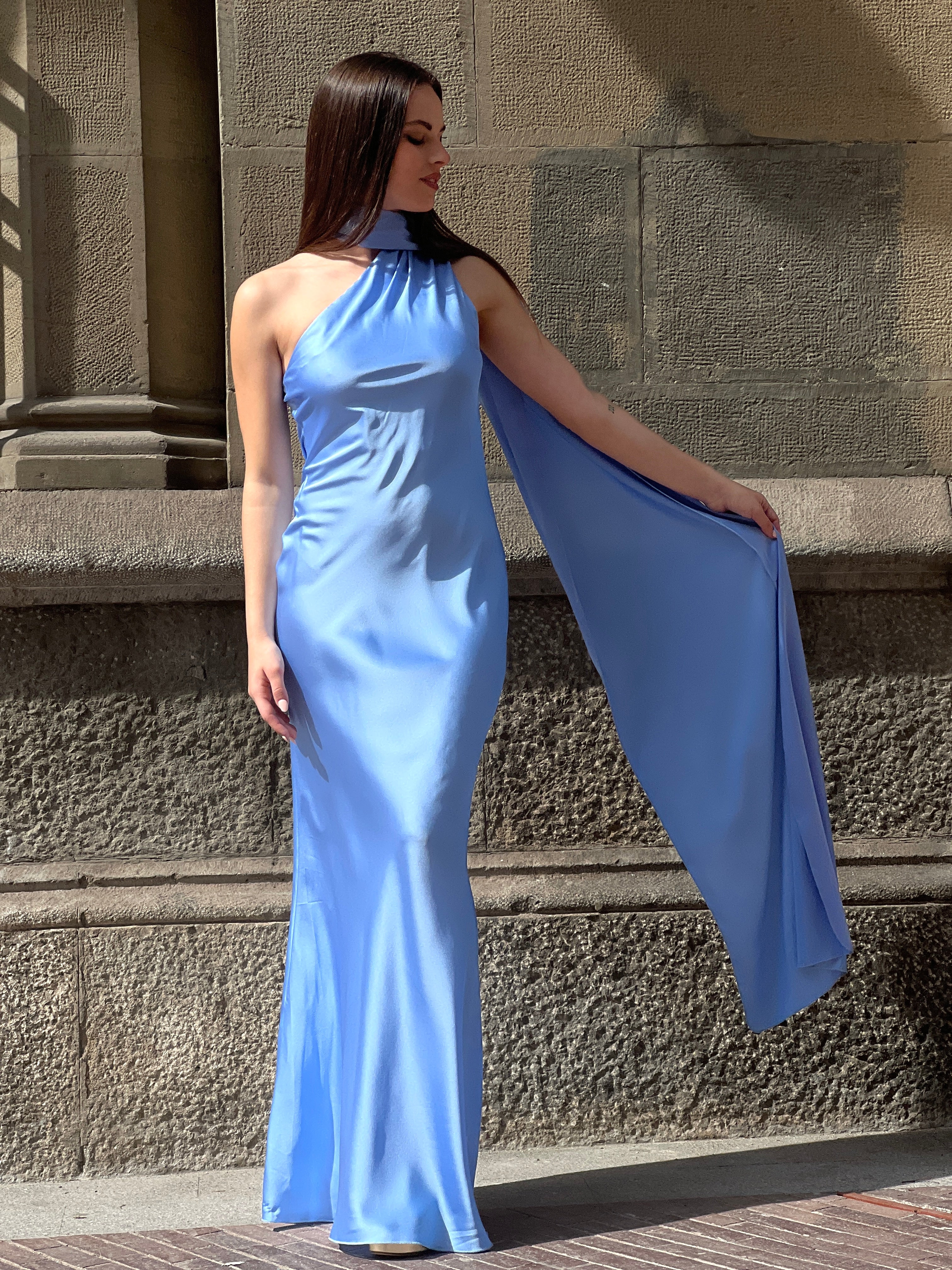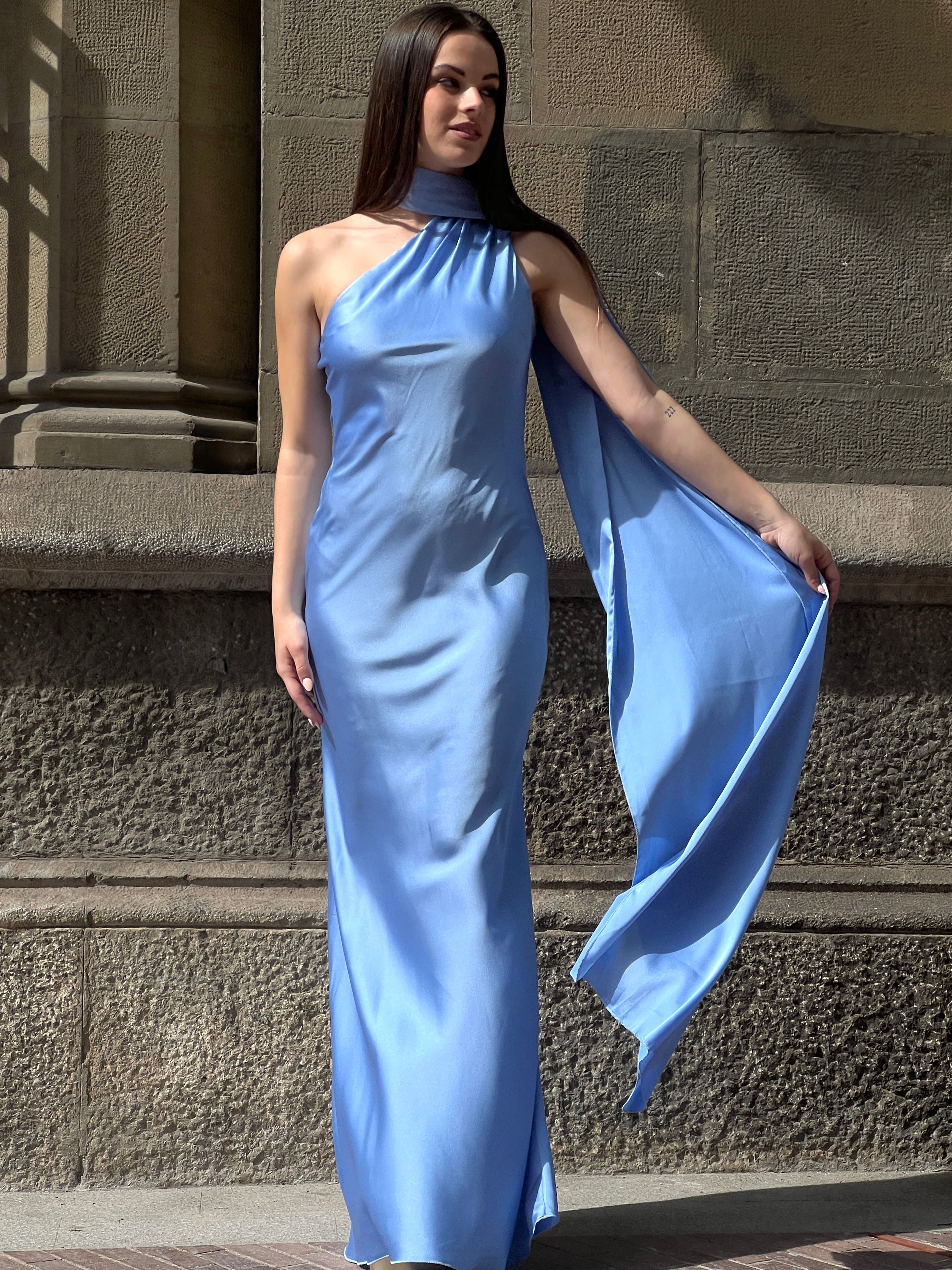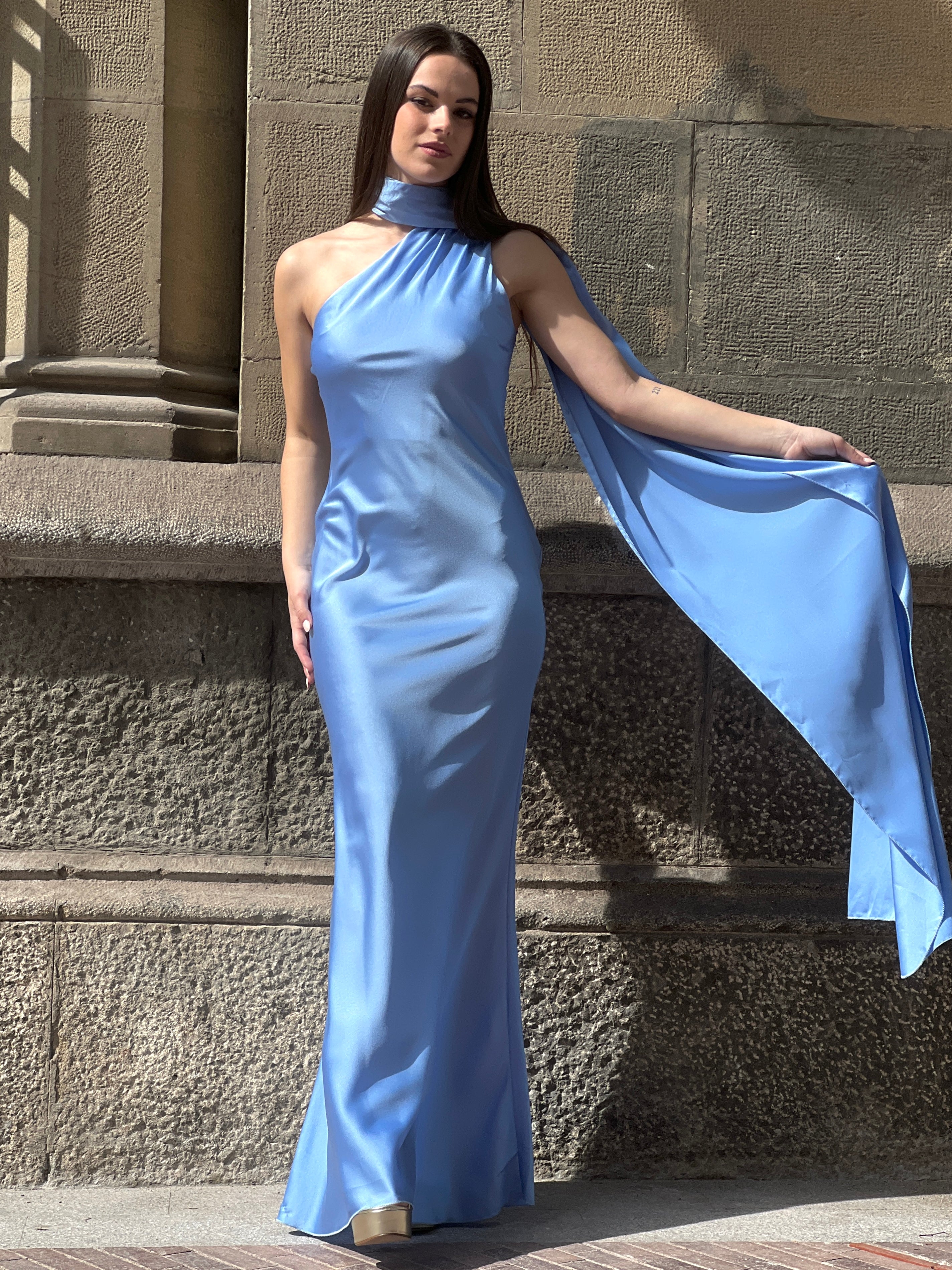 Profitez d'un look élégant et sophistiqué avec notre robe en satin Priscila. Parfaite pour des événements spéciaux comme les remises de diplômes. Son design sans fentes et avec un décolleté asymétrique vous donnera une touche unique. De plus, elle est dotée d'un foulard qui peut être porté de différentes manières, ajoutant un style choker à votre look.