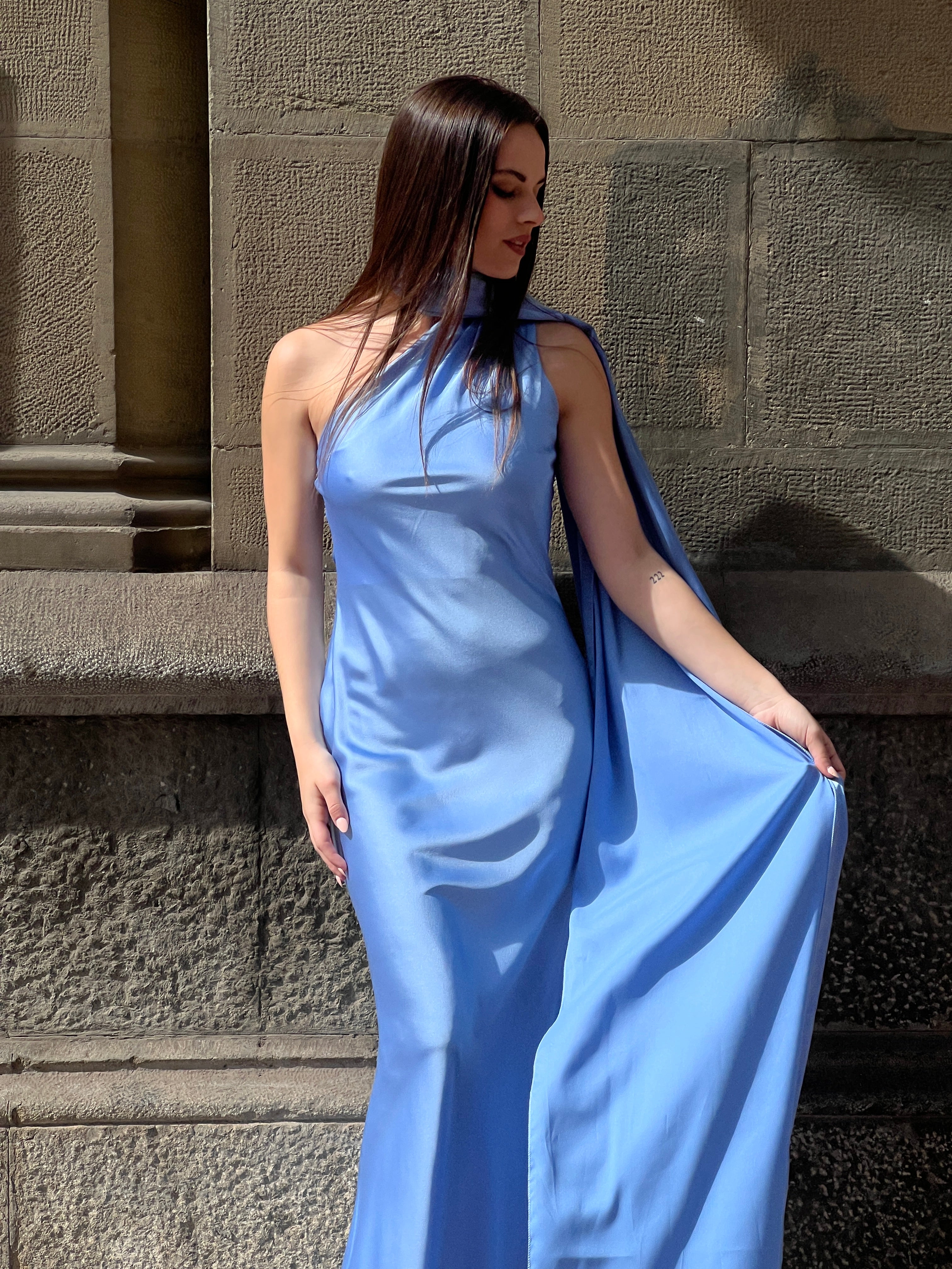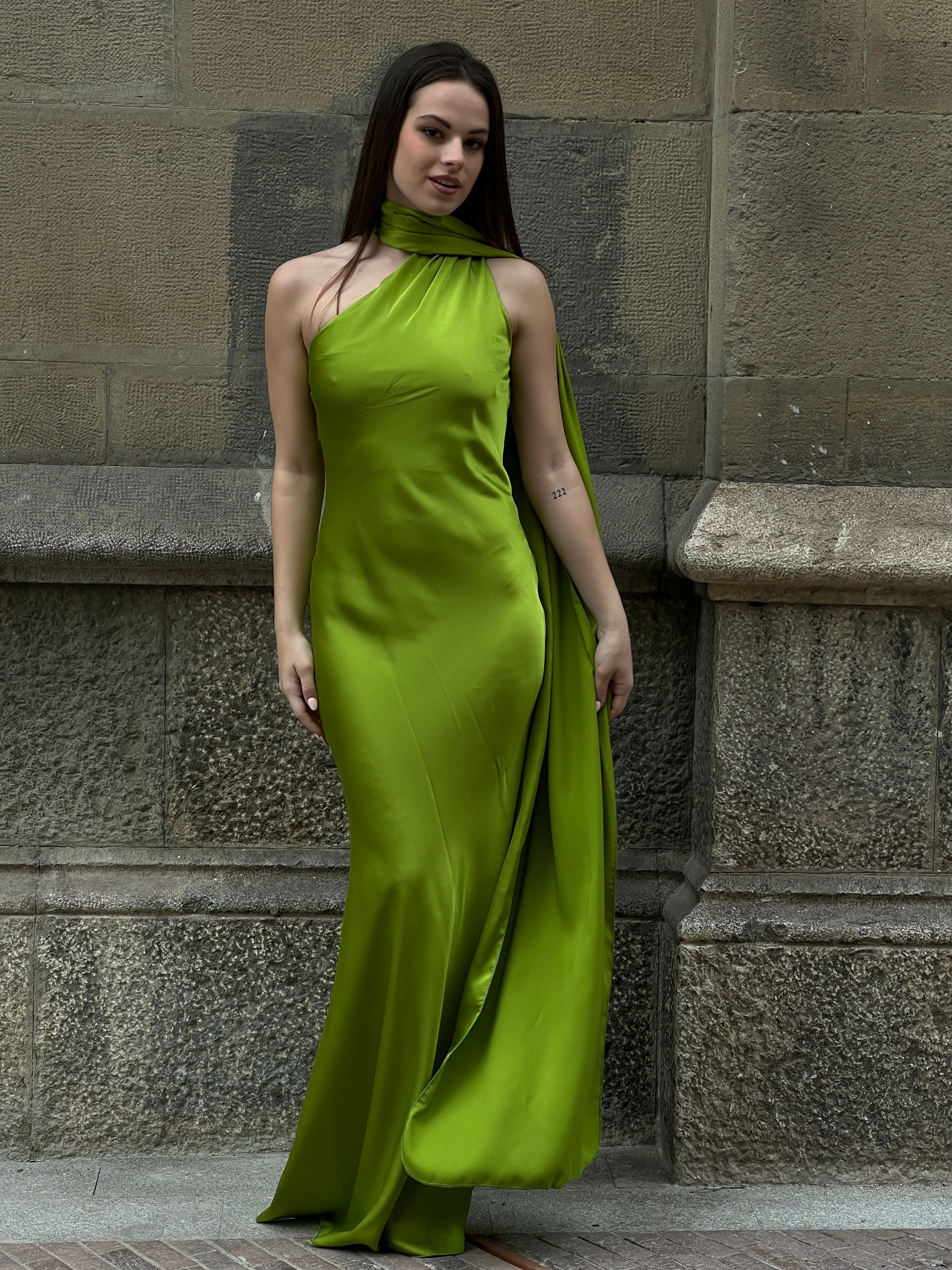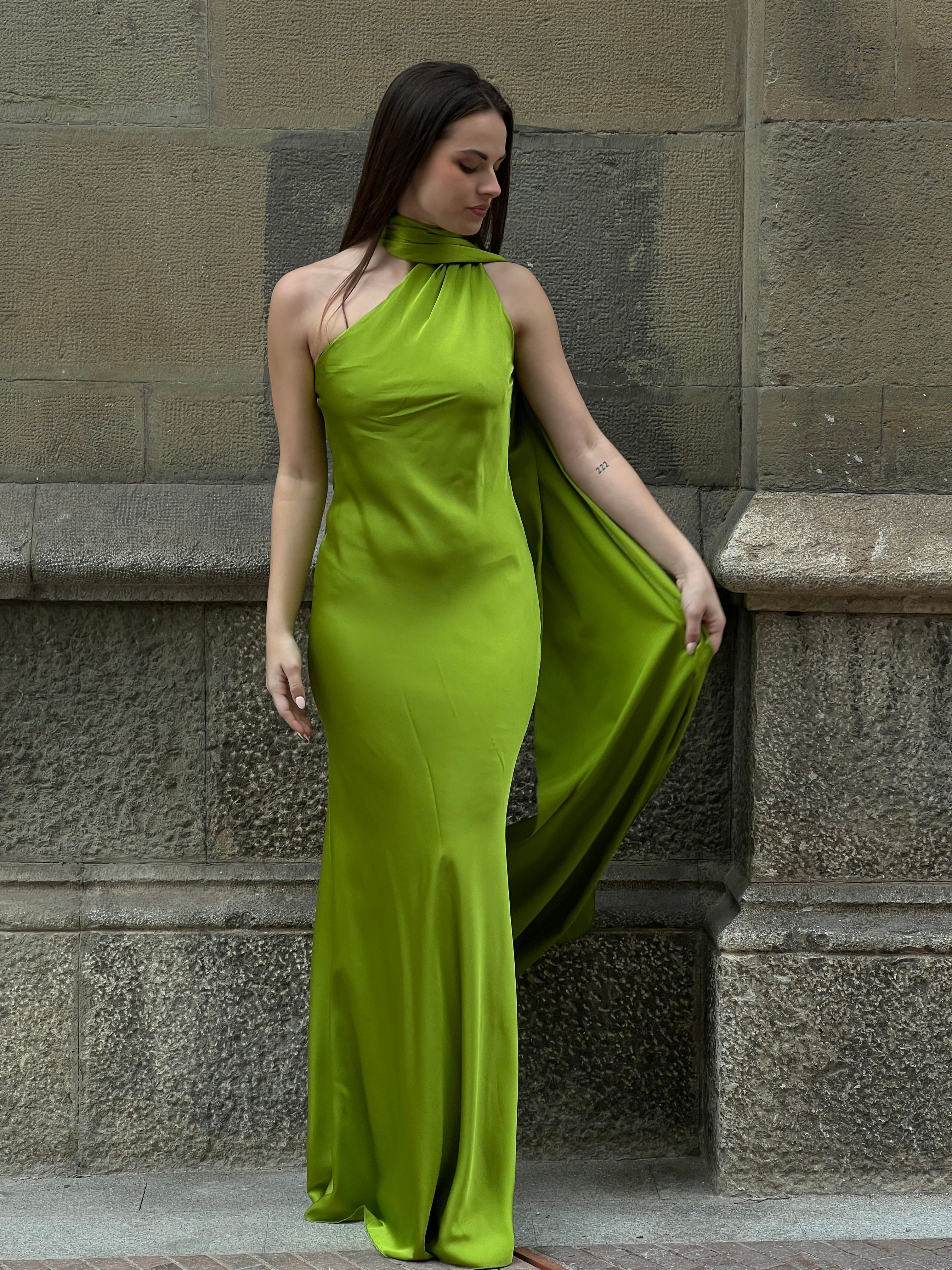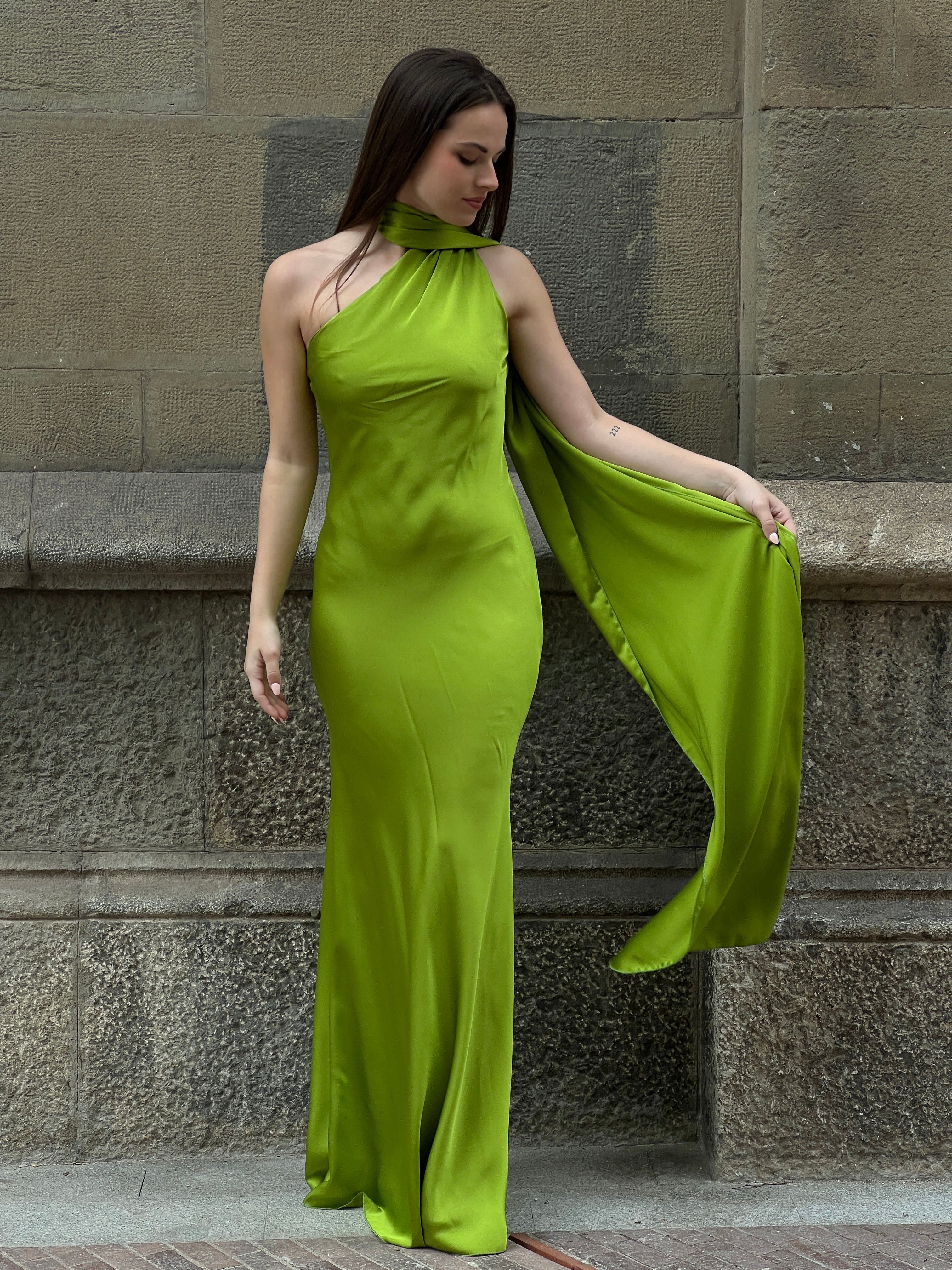 Profitez d'un look élégant et sophistiqué avec notre robe en satin Priscila. Parfaite pour des événements spéciaux comme les remises de diplômes. Son design sans fentes et avec un décolleté asymétrique vous donnera une touche unique. De plus, elle est dotée d'un foulard qui peut être porté de différentes manières, ajoutant un style choker à votre look.