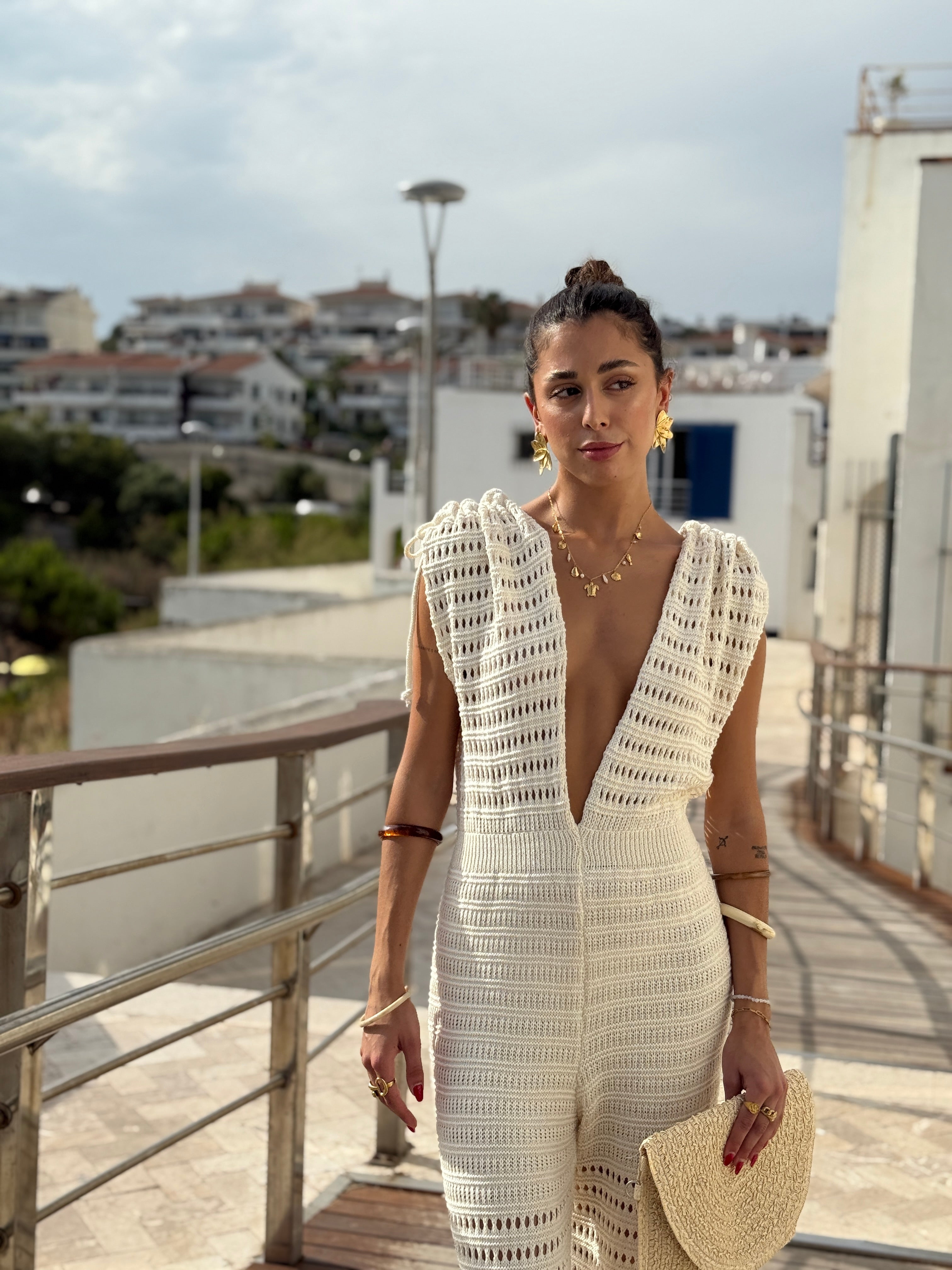 Combinaison sans manches à bretelles, avec un décolleté en V flatteur et un ajustement aux épaules pour plus de confort. Elle comprend un pantalon évasé qui affine la silhouette et une doublure intérieure pour une meilleure couverture. Un vêtement bohème et élégant, idéal pour les occasions spéciales ou les événements estivaux.