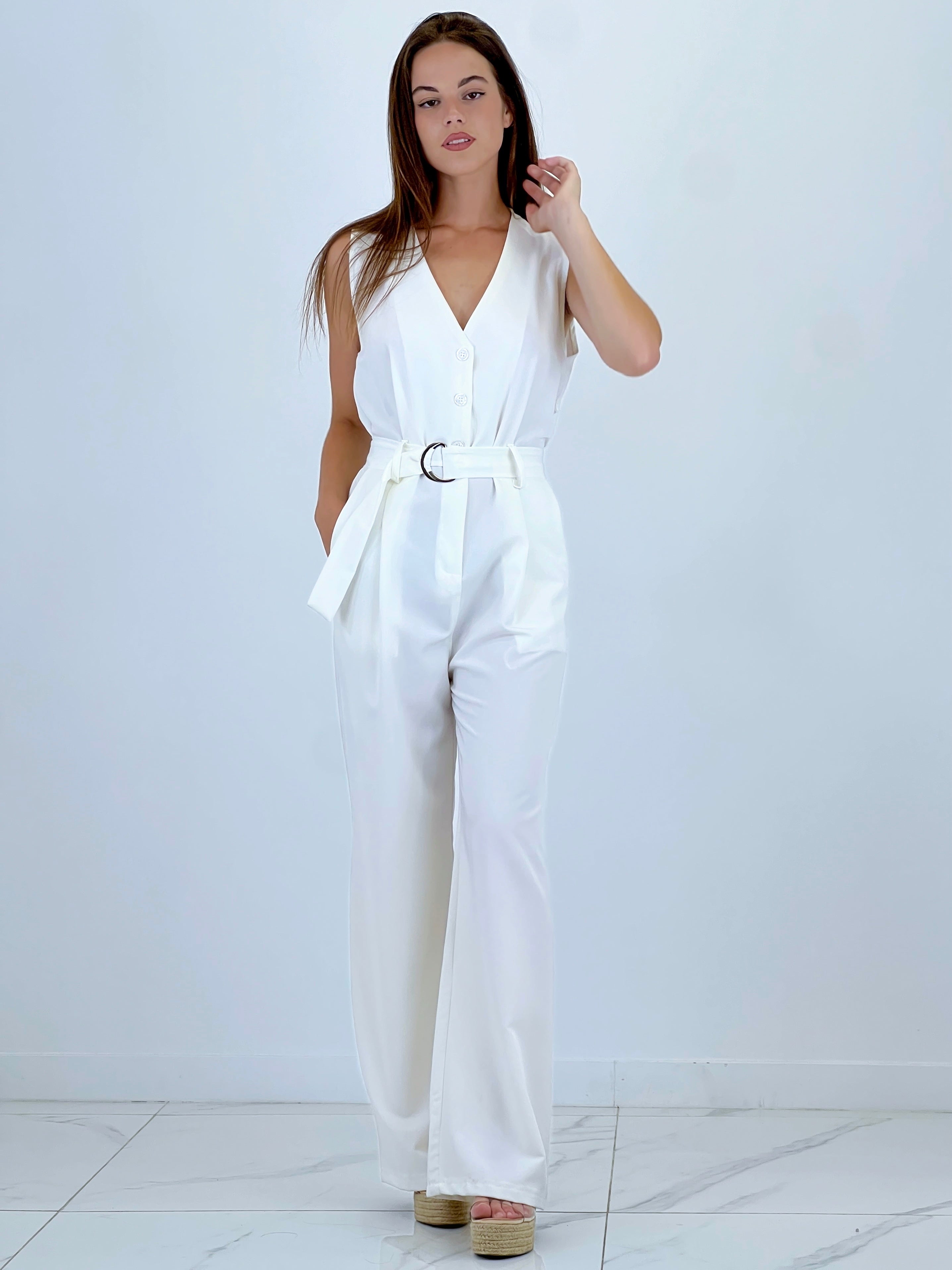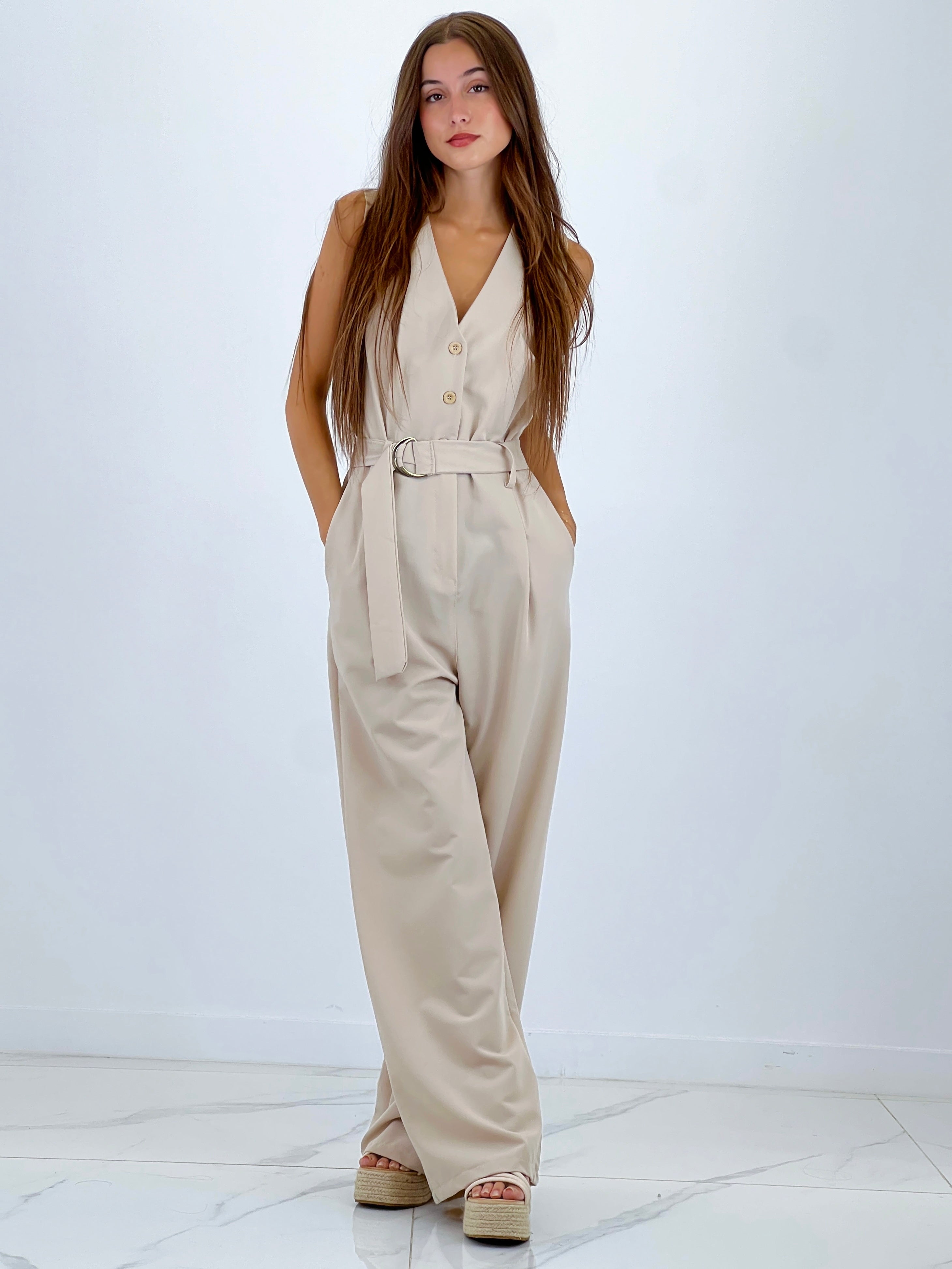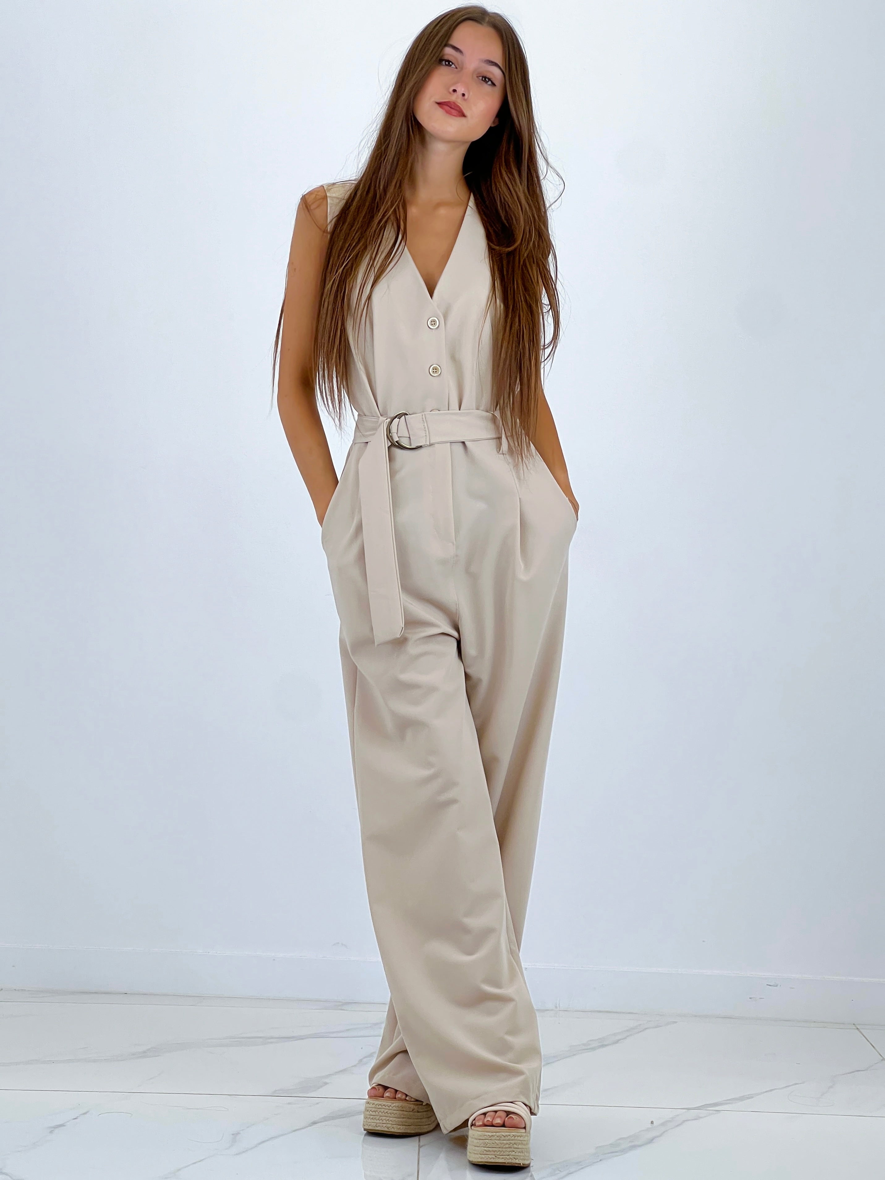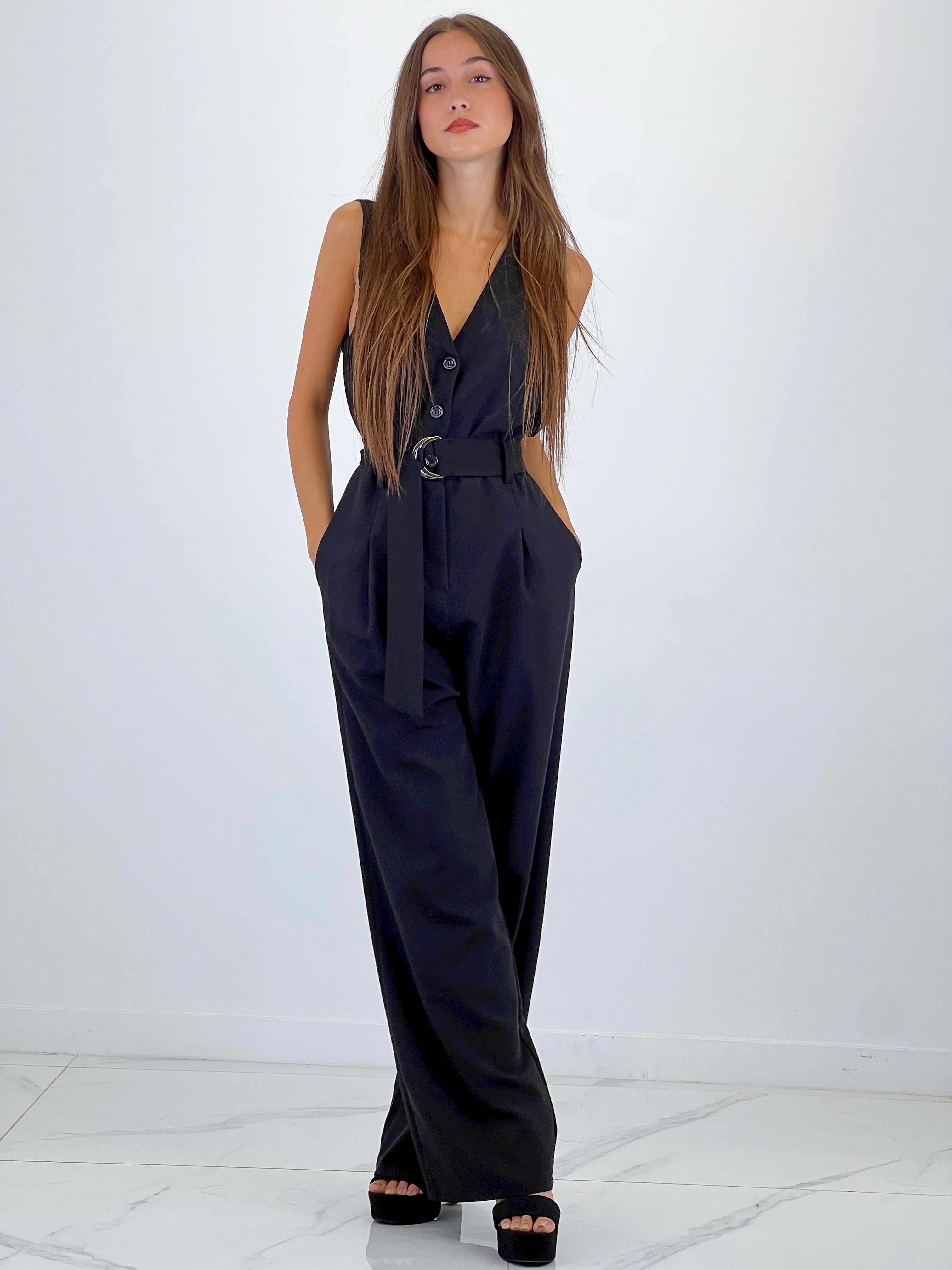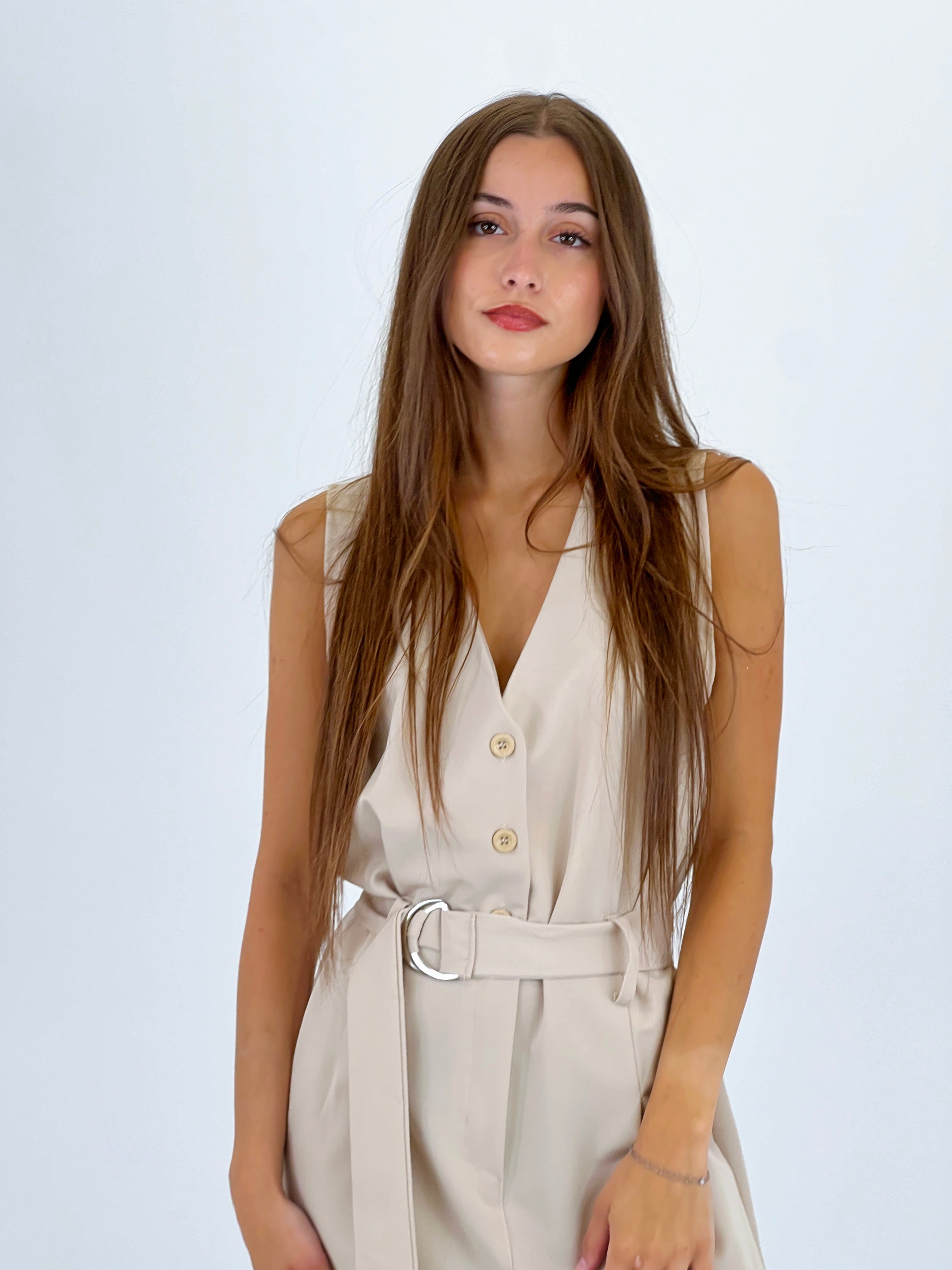 Mono ajusté à bretelles avec cordon à la taille.