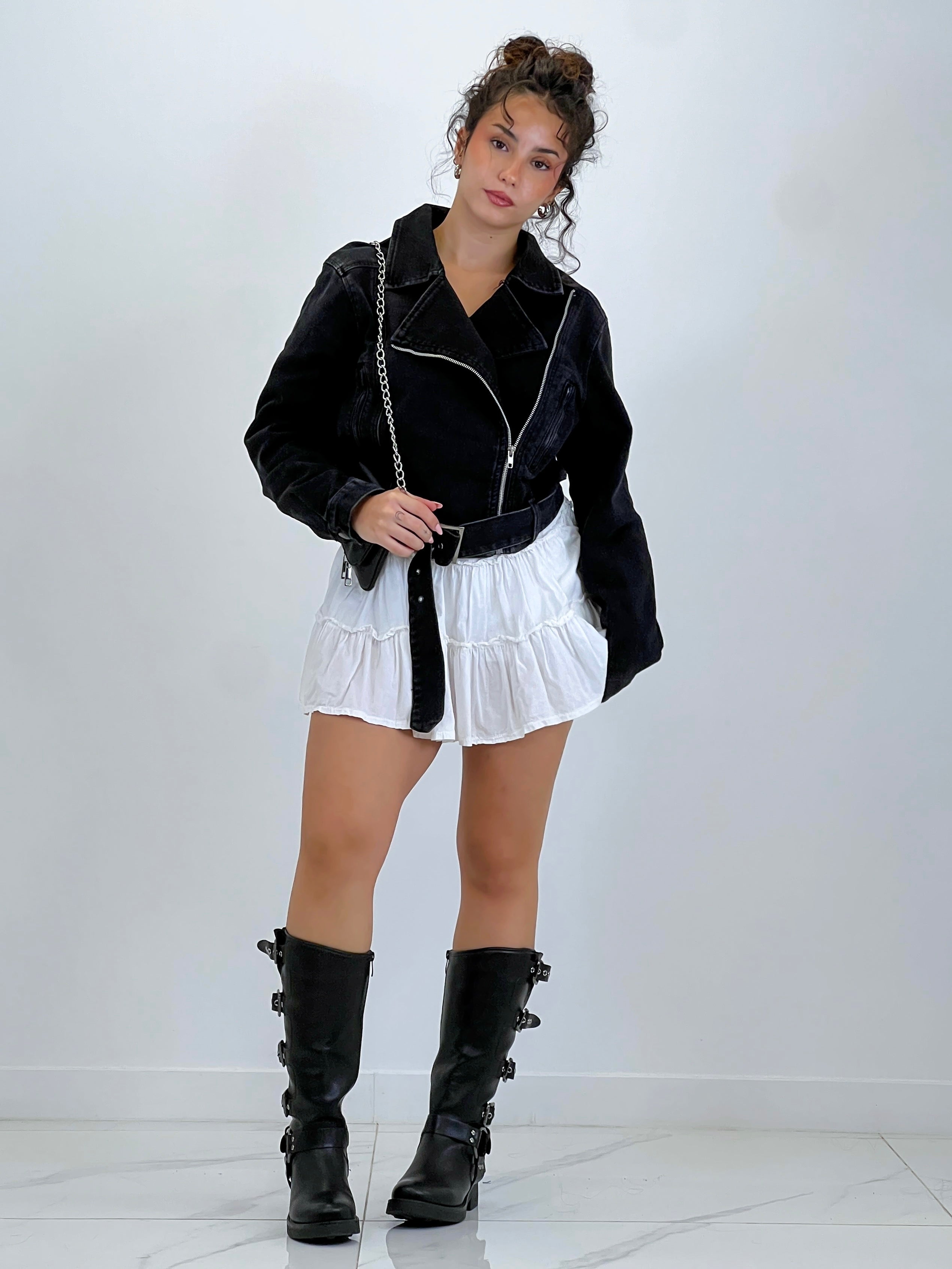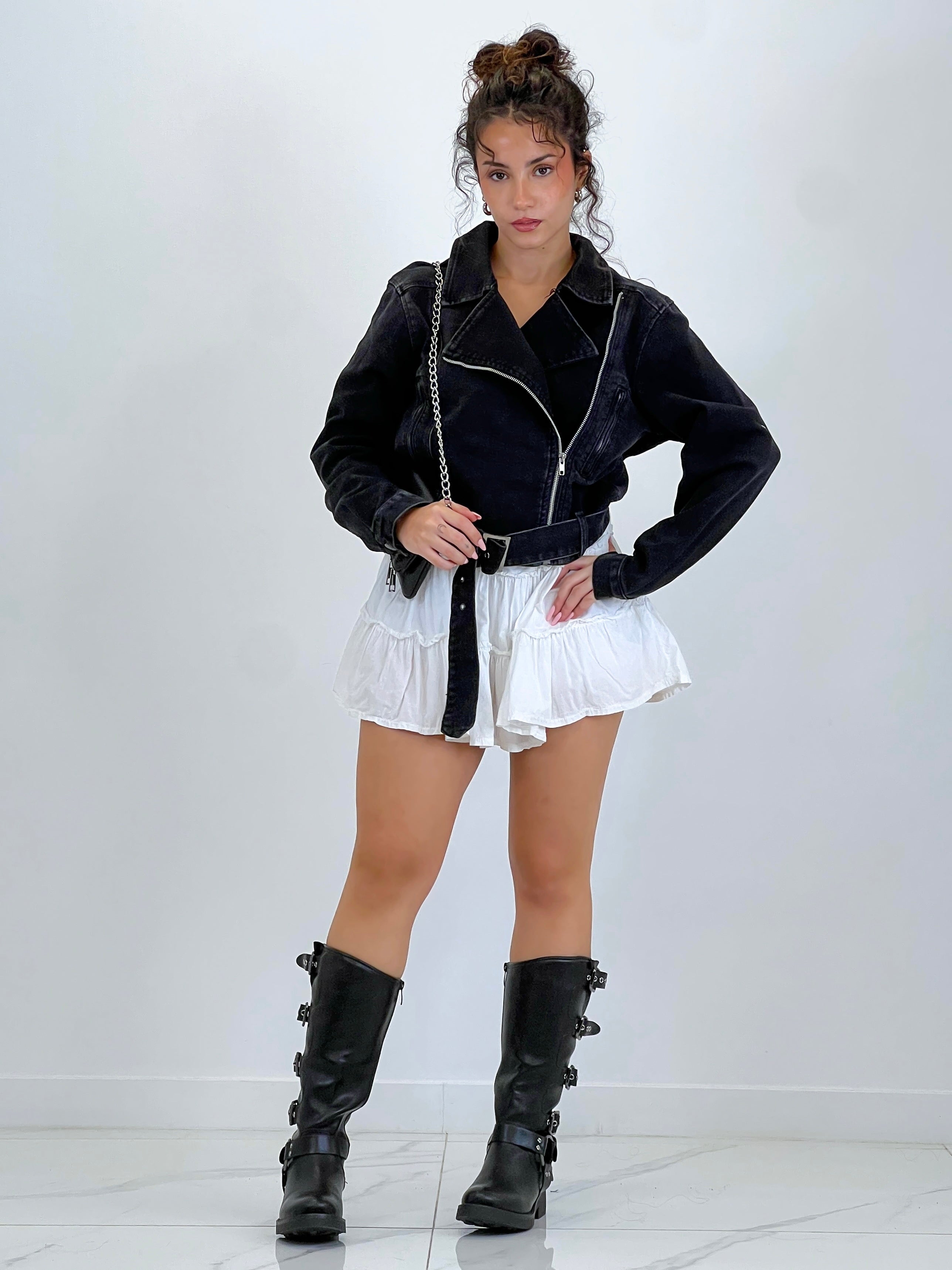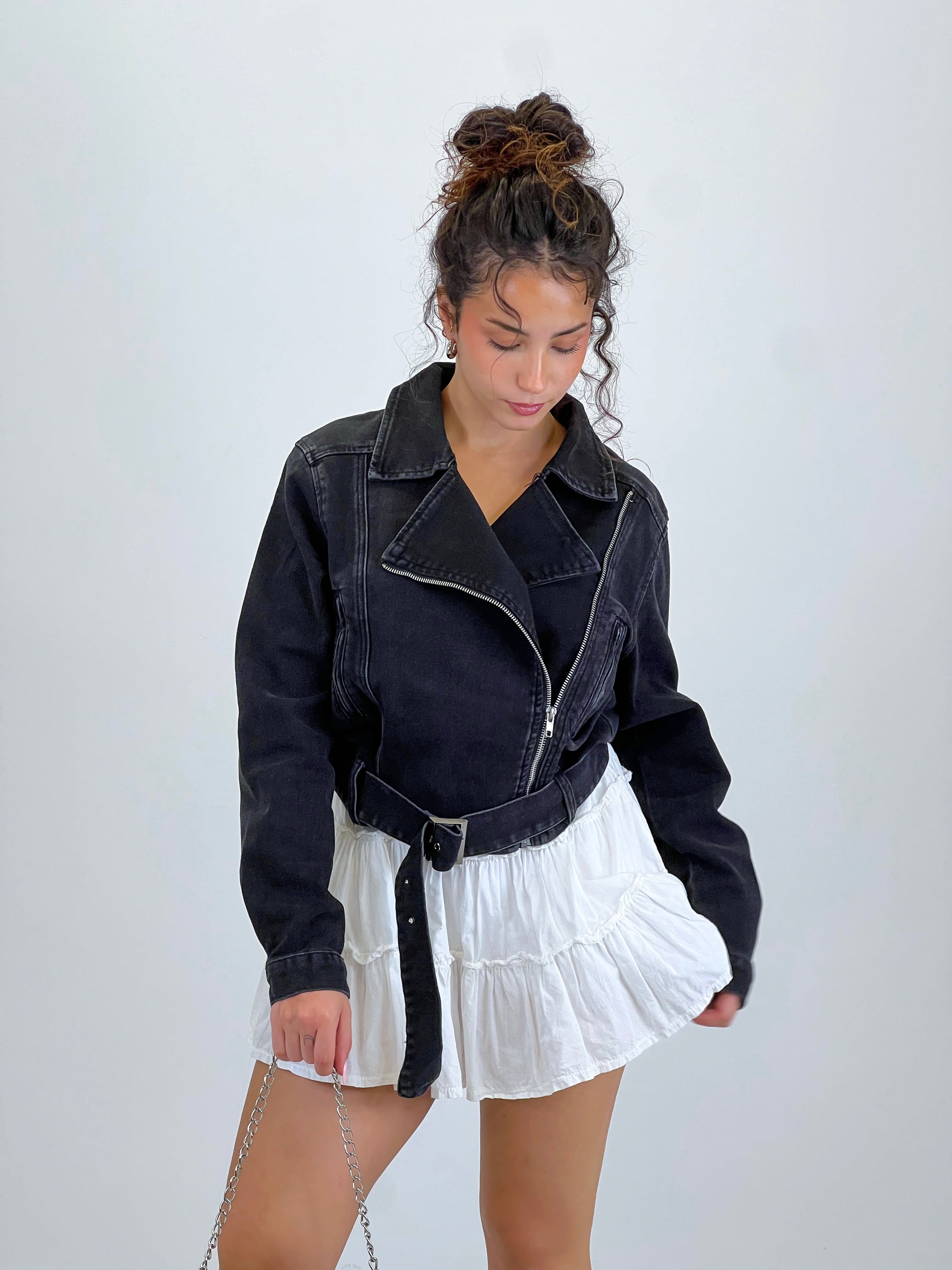 Biker denim con cuello solapa, bolsillos y cremallera lateral.