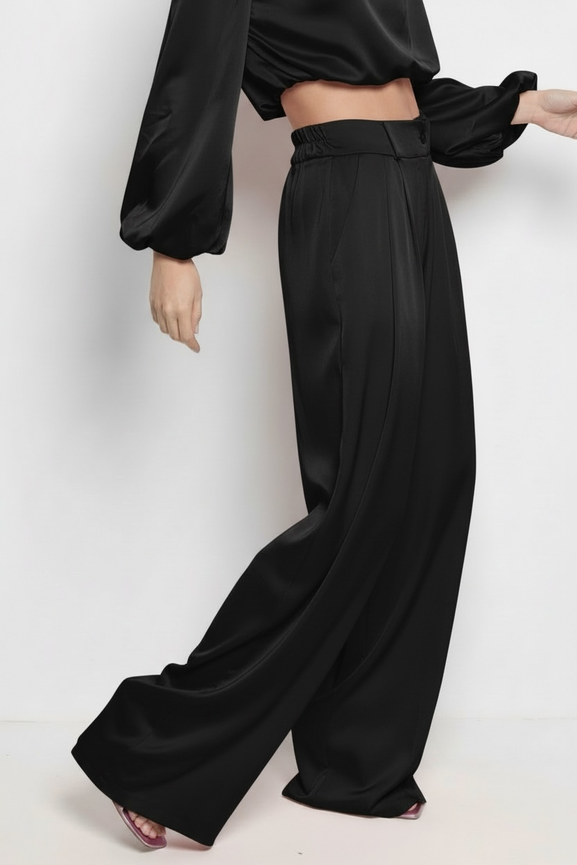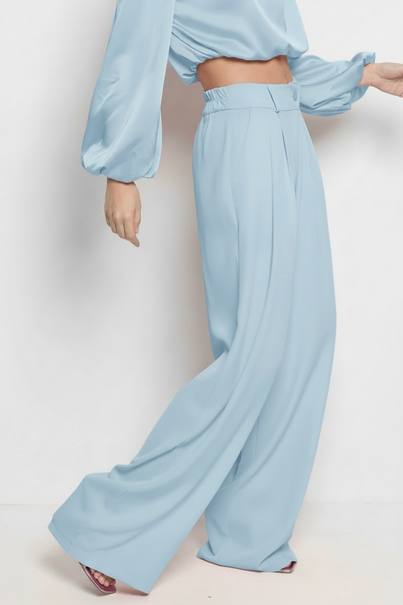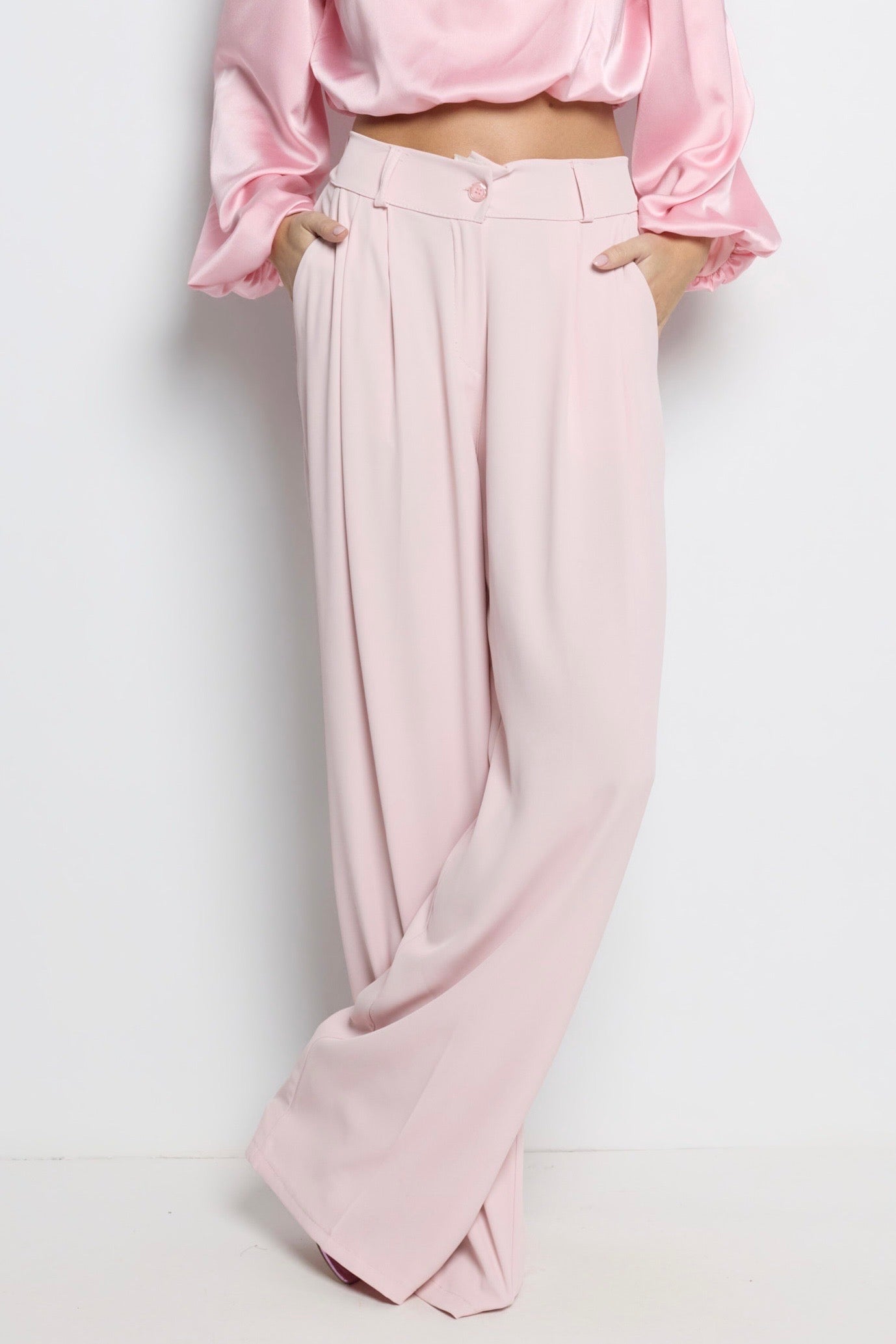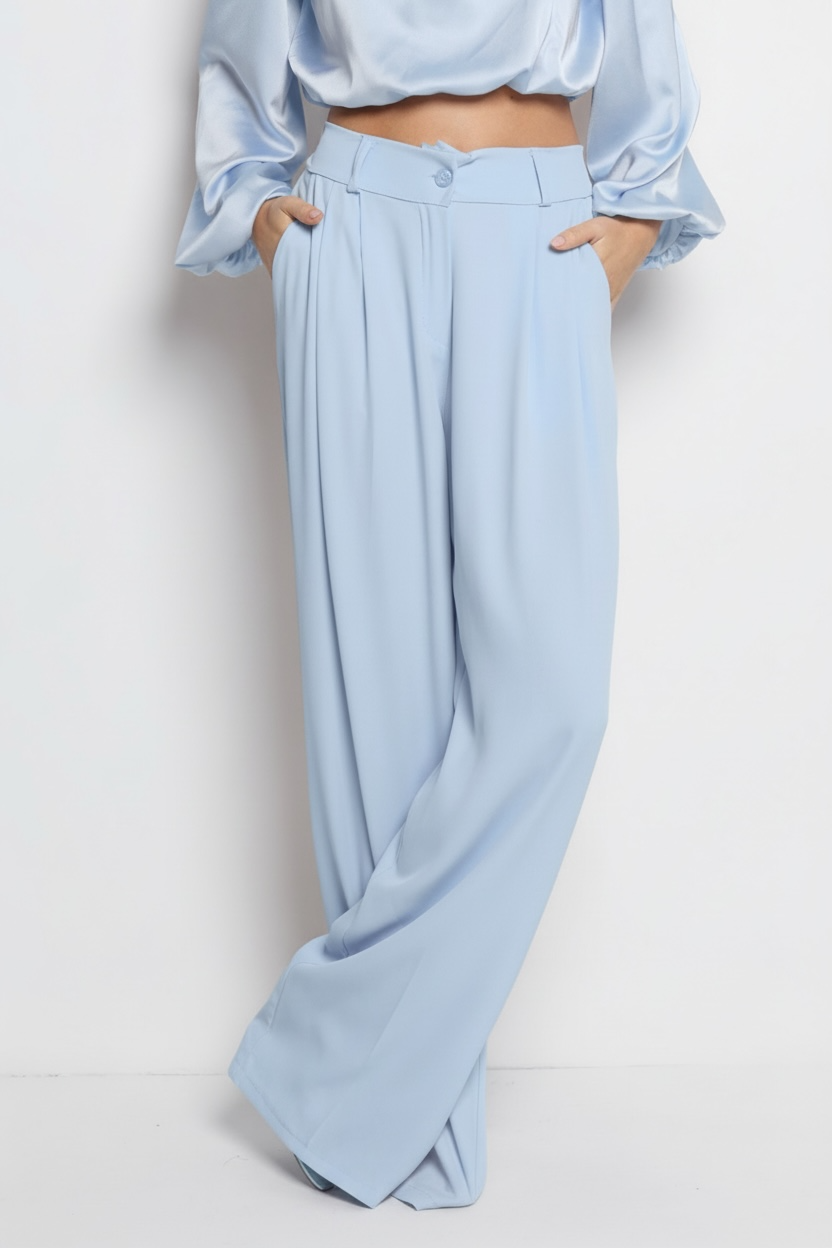 Calças de perna larga com pregas frontais que afinam a silhueta. Cintura reforçada com passadores para um ajuste seguro. Tecido com queda fluida que favorece o movimento. Disponível numa vasta gama de cores para se adaptar ao teu estilo pessoal.